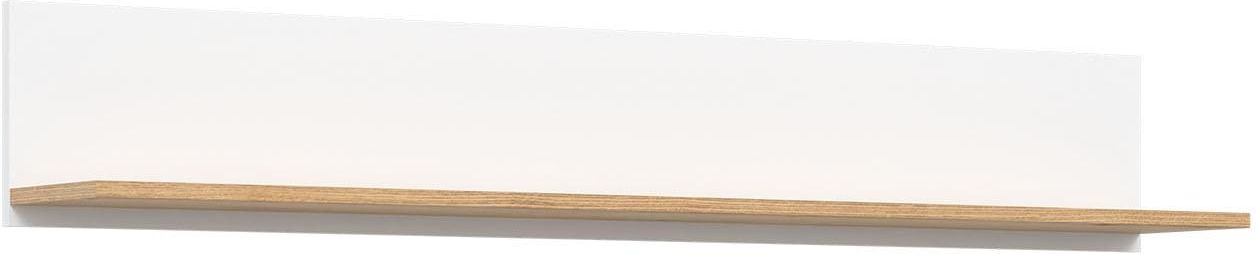 Półka wisząca ścienna na ścianę Biała REMI RM14 Półka wisząca REMI RM14 doskonale wkomponuje się w każdy typ pomieszczenia od salonu, poprzez gabinet aż do pokoju młodzieżowego. Oferowaną przestrzeń można wykorzystać do ekspozycji zbioru książek, rodzinnych pamiątek czy roślin doniczkowych. REMI RM14 charakteryzuje się lekkością i geometryczną prostotą dlatego mebel ten najlepiej łączy się z nowoczesnym wystrojem wnętrza. Na uwagę zasługuje ciekawe połączenie odcienia białego z naturalnym kolorem dębu evoke, który doskonale imituje rysunek usłojenia drewna. Biel dodaje pomieszczeniu świeżości, a także optycznie go powiększa. Model RM14 pochodzi z kolekcji REMI składającej się z 19 segmentów pozwalających umeblować dowolne pomieszczenie. Półka dostępna w czterech wariantach kolorystycznych. Mebel pakowany w częściach do samodzielnego montażu, wraz z czytelną instrukcją i akcesoriami montażowymi. Wymiary Szerokość: 137 cm Głębokość: 21,5 cm Wysokość: 22 cm Wykończenie Mebel został wykonany z wysokiej jakości płyty laminowanej, którą cechuje trwałość i odporność na czynniki mechaniczne oraz bezpieczeństwo użytkowania. Dodatkowym wzmocnieniem boków jest wytrzymałe obrzeże ABS. Wybarwienie Kolor korpusu: biały / dąb evoke Kolor frontu: biały / dąb evoke Fotografie