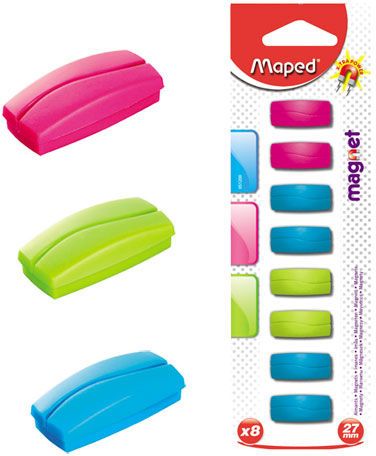 Magnesy prostokątne, 27 mm, mix kolorów: różowy, niebieski i zielony. Atrakcyjne kolory i kształty, wysokie właściwości magnetyczne. 8 sztuk na blistrze. JS blister.