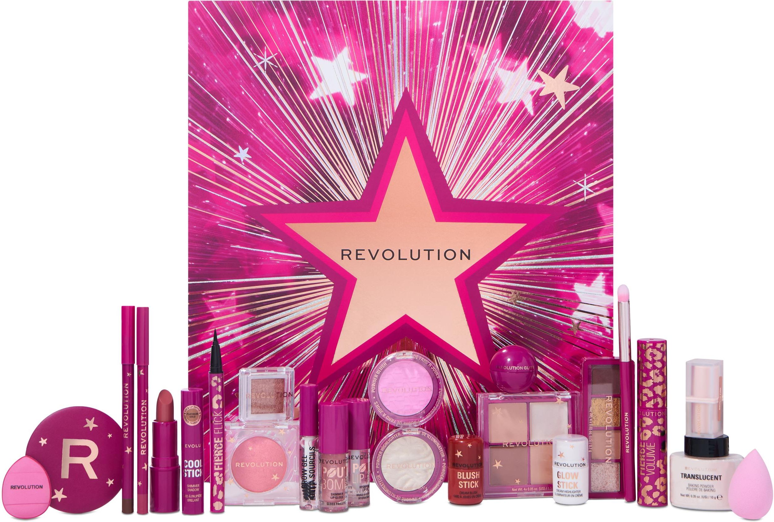 MAKEUP REVOLUTION - Magical Makeup Beauty Advent Calendar - Kalendarz adwentowy z kosmetykami do makijażu Magical Makeup Beauty Advent Calendar marki MAKEUP REVOLUTION. Kalendarz adwentowy z kosmetykami do makijażu. Jak za dawnych dziecięcych czasów przywróci świąteczny i magiczny nastrój oczekiwania na pierwszą gwiazdkę. Rozpieść siebie bądź bliskich specjalnym świątecznym zestawem od marki Makeup Revolution już dziś. Składa się on z 24 produktów, niezbędnych do wykonania niesamowitego codziennego, jak i wieczorowego make-upu. Każdego dnia można otwierać pojedyncze okienko, ciesząc się nowo odkrytą "perełką" kosmetyczną. Oczywiście nikt nie zabrania odsłonięcia całej zawartości za jednym podejściem, w szczególności kiedy dostanie się go pod choinkę. Twój prezent - Twoje zasady! Dzięki uroczemu opakowaniu przywodzi na myśl świąteczny upominek. Kalendarz adwentowy. Składa się z 24 produktów. Idealny na prezent dla bliskiej osoby. Umożliwi wykonanie perfekcyjnego make-upu. W SKŁAD ZESTAWU WCHODZĄ:- Revolution Pout Bomb Shimmer Lip Gloss Shine Pink Mini - Mini błyszczyk do ust z brokatem - 1,4 ml, - Revolution Pout Lip Oil Clear Mini - Mini olejek do ust, przezroczysty - 1,4 ml, - Revolution Satin Kiss Lipstick Heartrace Nude - Pomadka do ust - 3,4 g, - Revolution Reloaded Highlighter Mini Golden Lights - Mini rozświetlacz do twarzy - 2,5 g, - Revolution Reloaded Highlighter Mini Silver Shimmer - Mini rozświetlacz do twarzy - 2 g, - Revolution Reloaded Blush Mini Neon Pink - Mini róż do policzków - 2,5 g, - Revolution Lip Allure Soft Satin Lipstick Crunch Pink Mini – Mini pomadka do ust - 1,2 g, - Revolution Blush Stick Strawberry Pink - Róż w sztyfcie - 2 g, - Revolution Glow Bomb Lip Balm - Balsam do ust - 5 g, - Revolution Beam Blush Peach Pop - Róż do policzków - 4,5 g, - Revolution Cream Contour Quad Mini - Mini paleta do konturowania w kremie - 1,5 g, - Revolution Cooling Shadow Stick Platinum Gold - Cień do powiek w sztyfcie - 3 g, - Revolution Satin Kiss Lipliner White Wedding Nude - Konturówka do ust - 1 g, - Revolution Single Shimmer Shadow - Pojedynczy cień do powiek z brokatem - 1,2 g, - Revolution Baking Powder Translucent Mini - Mini puder sypki transparentny - 10 g, - Revolution Makeup Sponge - Gąbka do makijażu, - X2 Revolution Finger Blending Sponge - 2x gąbeczka do rozcierania cieni na palec, - Revolution Fluffy Eye Brush - Puszysty pędzel do oczu, - Revolution Mirror - Lusterko, - Revolution Kohl Eyeliner Brown - Kredka do oczu typu kohl, kolor brązowy - 1,3 g, - Revolution Fierce Felt Eyeliner Pen Black - Eyeliner w pisaku, kolor czarny - 0,6 ml, - Revolution Fierce Mascara Black Mini - Mini czarny tusz do rzęs - 5 g, - Revolution Brow Gel Clear - Bezbarwny żel do brwi - 3,5 ml, - Revolution Icon Mini Palette Eyeshadows - Mini paletka cieni do powiek Icon - 4 x 0,7 g. Atrybuty PAO termin trwałości - 6M