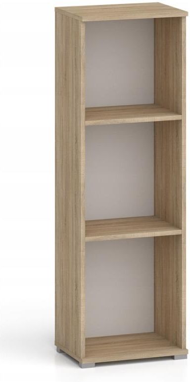 Regał biurowy niski, otwarty, na książki RELIC dąb sonoma 110 x 30 x 40 cm Regały z seriiRELIC to solidnie wykonane stabilne meble przeznaczone do biur i pomieszczeń domowych. Regały dostępne są w czterech modnych wariantach kolorystycznych oraz występują w różnych wersjach wielkościowych z drzwiczkami lub bez. Do wyboru szerokość (30 cm, 40 cm, 60 cm, 80 cm), wysokość (110 cm, 215 cm), głębokość (32 cm, 40 cm). Informacje dodatkowe klasyczne wzornictwo trzy wytrzymałe półki dopasowany do segregatorów biurowych podwyższona trwałość i odporność na uderzenia możliwość montażu bez nóżek korpus w kolorze dąb sonoma Regał do samodzielnego montażu z czytelną instrukcją. Wymiary szerokość 30 cm wysokość 110 cm głębokość 40 cm wysokość półek 33,5 cm Materiał. Korpus wykonano z płyty laminowanej producenta Kronopol o grubości 16 mm w kolorze dąb sonoma. Plecy zrobiono z płyty HDF 3 mm. Obrzeża. Krawędzie płyty są oklejone PCV odpornym na wilgoć i zarysowania.
