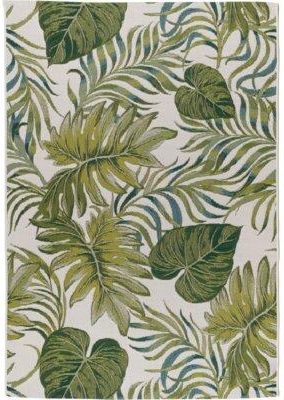 Dywan zewnętrzny Cappucino marki E-FLOOR o wymiarach 80 x 165 cm w kształcie prostokąta, tkany na płasko. Roślinne wzory w odcieniach beżowych i zielonych, nadają mu egzotycznego charakteru i wprowadzają klimat tropikalnego raju.