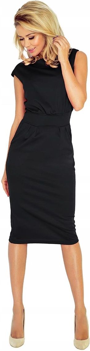 Sukienka midi SARA z podwyższonym stanem i kieszonkami - CZARNA Sukienka o taliowanym kroju podkreślającym sylwetkę. Wykonana z lekko uciągliwego materiału. Zapinana z boku na kryty ekspres. Na wysokości bioder dwie niezapinane kieszenie. Półokrągły dekolt. Krótkie rękawy. Szeroki pas pięknie podkreśla talię. Długość za kolano. Model nie posiada podszewki. Produkt najwyższej jakości pochodzący w 100% z polskiej produkcji. Produkt Polski marki Numoco 144-3 Skład 95% poliester 5% elastan NAJLEPIEJ PORÓWNUJĄC JE ZE SWOJĄ ULUBIONĄ DOBRZE LEŻĄCĄ ODZIEŻĄ. PROSZĘ PRZYJĄĆ GRANICĘ BŁĘDU (+/-) 2cm. Wymiary Rozmiar: 34 XS Wymiary mierzone są na płasko - bez rozciągania materiału (+/- 2 cm) Od pachy do pachy: 43cm Talia: 32cm Biodra: 43cm Dł. od pachy: 93cm Dł. od ramienia: 108cm