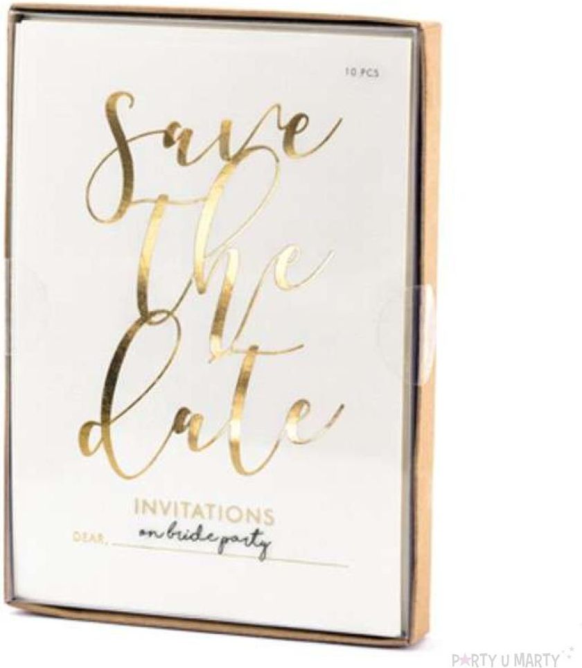 Zaproszenia Save the date w kolorze białym ze złotym metalizowanym napisem w zestawie z kopertami. Idealne na wieczór panieński. biały,doklejka topy Wieczór Panieński,PartyDeco,prostokątny,Wieczór Panieński