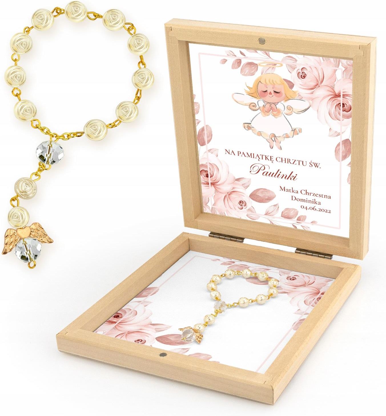Dziesiątek różańca na CHRZEST ŚWIĘTY Wykonany z masy perełkowej dziesiątek różańca to doskonały upominek dla dziecka przyjmującego Chrzest Święty. Ozdobne skrzydła anioła tak jak pozostałe koraliki połączone są metalowym splotem. Różaniec zapakowany będzie w drewnianą szkatułkę z nadrukiem dedykacji. To piękna pamiątka tego ważnego dnia. Parametry Różaniec wykonany z masy perełkowej paciorki w kształcie różyczek metalowe łączenia koralików ozdobne skrzydła anioła przy początkowym paciorku kryształki: 6 mm długość różańca: 13 cm dziesiątek zapakowana jest w woreczek z organzy Pudełko wymiary szkatułki: ok. 17 x 15 x 2,5 cm wykonana z naturalnego drewna w środku szkatułki umieszczony jest piękny nadruk szkatułka zamykana na magnes polski producent wysoka jakość wykonania Wybrany wzór i dane do personalizacji podaj w wiadomości do sprzedającego. Wybrany wzór i dane do personalizacji podaj w wiadomości do sprzedającego.