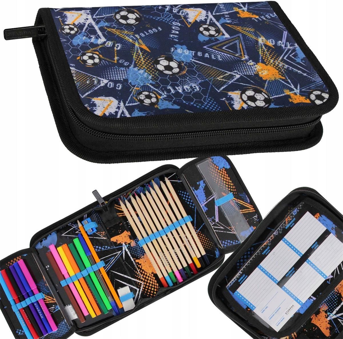 Piłka Nożna Piórnik DWUKLAPOWY z wyposażeniem ROZKŁADANY, DLA PIŁKARZA Ten piórnik z kolekcji Football Blue to praktyczny i kompletnie wyposażony organizer szkolny z 29 elementami, w tym kredkami, flamastrami, długopisem, linijką, ołówkiem i innymi niezbędnymi przyborami. Solidny materiał, trwały zamek i sportowy design czynią go idealnym dla aktywnych uczniów. Po rozłożeniu daje łatwy dostęp do całej zawartości, a po złożeniu zajmuje niewiele miejsca w plecaku. ------------------------------------- kod produktu: 551894 Piórnik z wyposażeniem Football Blue STARPAK – gotowy zestaw szkolny dla młodego piłkarza! NAJWAŻNIEJSZE CECHY PRODUKTU 29 elementów w zestawie – wszystkie niezbędne przybory w jednym piórniku. Motyw piłkarski – atrakcyjny design dla fanów piłki nożnej. 2 rozkładane klapki – szybki i wygodny dostęp do zawartości. Solidne wykonanie – trwałe tworzywo i mocny zamek. Łatwy do spakowania – kompaktowy po złożeniu, idealny do plecaka. Zestaw dla dzieci 3+ – odpowiedni już od najmłodszych uczniów. Sprawdź nasze inne aukcję – znajdziesz tam akcesoria szkolne w tym samym wzorze, idealne do kompletu!