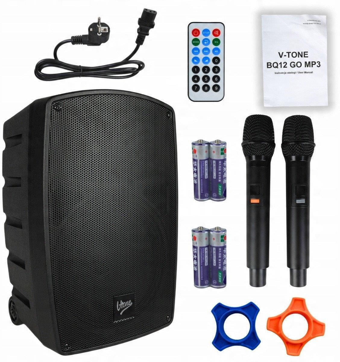 KOLUMNA AKTYWNA AKUMULATOROWA 200W Bluetooth TWS USB PILOT + 2x mikrofon bezprzewodowy wysuwana rączka kółka transportowe zestaw Mobilna moc i jakość dźwięku bez kompromisów Szukasz niezawodnego i poręcznego nagłośnienia do imprez, wydarzeń plenerowych czy występów na żywo. V-TONE BQ12 GO MP3 to kolumna aktywna z wbudowanym akumulatorem, która zapewni Ci moc 200W RMS oraz czyste brzmienie dzięki dwudrożnej konstrukcji, wzmaniaczowi klasy D i procesorowi DSP z wbudowanymi presetami . Bluetooth 5.1 z funkcją TWS umożliwia szybkie połączenie bezprzewodowe ze smartfonem lub laptopem . Niezależnie od tego, czy jesteś DJ-em, animatorem, nauczycielem fitness, czy po prostu kochasz dobrą muzykę – ten zestaw zaspokoi Twoje potrzeby . Przemyślana konstrukcja z wysuwaną rączką i kółkami sprawia, że transport jest banalnie prosty. Pełna kontrola i funkcje na wyciągnięcie ręki Steruj urządzeniem bez żadnych problemów dzięki ręcznemu panelowi, pilotowi bezprzewodowemu na podczerwień (IR) lub połączeniu Bluetooth ze wsparciem TWS . Trzy niezależne kanały wejściowe z licznymi portami pozwalają podłączyć mikrofony, instrumenty lub inne zewnętrzne źródła audio jednocześnie. Wyjście zasilania 5V1A typu USB-A pozwala na ładowanie urządzeń zewnętrznych . Korekcja graficzna z regulacją tonów niskich i wysokich oraz efekt reverb dają ogromne możliwości kreowania brzmienia. Do tego 4 presety DSP (Normal, DJ, Live, Speech) gwarantują perfekcyjne dopasowanie do każdego zastosowania . Możesz też nagłaśniać z kart SD, pendrive’a (dzięki wbudowanemu odtwarzaczowi MP3) lub smartfona Bezprzewodowa swoboda oraz praktyczne akcesoria W zestawie znajdują się dwa dynamiczne mikrofony doręczne pracujące w paśmie UHF (518-542 MHz) . Ich stabilny zasięg i wygodna obsługa sprawiają, że idealnie sprawdzą się w sali konferencyjnej, na imprezie czy w plenerze pod dachem. Pierścienie zapobiegające toczeniu w jaskrawych kolorach to praktyczny i estetyczny dodatek . Wbudowany schowek na mikrofony ułatwia organizację po wydarzeniu . Zasilanie bateryjne, wygodne przełączniki zasilania i wyświetlacze LED mikrofonów gwarantują pełną kontrolę . Zabierz muzykę wszędzie i graj przez cały dzień Dzięki akumulatorowi 12V 7000 mAh możesz grać do 12 godzin bez przerwy . Wskaźnik ładowania i poziomu energii dają Ci pełny obraz sytuacji źródła zasilania w każdej chwili. Transport? Żaden problem – solidna obudowa z tworzywa ABS, wysuwana rączka i kółka to gotowość do drogi w kilka sekund . Niezależnie czy to piknik rodzinny, prezentacja w szkole, wesele w plenerze czy pokaz uliczny – V-TONE BQ12 GO MP3 sprosta każdemu wyzwaniu. Zainwestuj w mobilny zestaw nagłośnieniowy Nie czekaj – wybierz sprzęt, który pracuje dla Ciebie, nie odwrotnie. Postaw na najlepsze połączenie mobilności, jakości i funkcjonalności. Kliknij „Dodaj do koszyka” i zyskaj swobodę działania, gdziekolwiek jesteś W zestawie akumulatorowa kolumna aktywna, 2 mikrofony bezprzewodowe doręczne, 2 pierścienie przeciw toczeniu mikrofonów, 4 baterie AA, pilot bezprzewodowy na podczerwień (IR), przewód zasilający IEC (C13), instrukcja obsługi (PL/EN). Specyfikacja techniczna Typ urządzenia: kolumna aktywna akumulatorowa Bluetooth z zestawem akcesoriów Konstrukcja: dwudrożna Wzmacniacz: klasa D Moc znamionowa (RMS): 200W Głośnik niskotonowy: 12", magnes 40 oz, cewka drgająca 2" Głośnik wysokotonowy: 1", polimerowy, kompresyjny Impedancja: 4Ω Pasmo przenoszenia: 55-20000 Hz Poziom ciśnienia akustycznego (SPL): 118 dB Poziom napięcia sygnału wejściowego: < 5 mV Poziom napięcia sygnału wyjściowego: 250 mV Transmisja sygnału: przewodowa lub bezprzewodowa Sterowanie: ręczne, pilot bezprzewodowy na podczerwień (IR), Bluetooth Bluetooth: 5.1, TWS Kanały: 3 Korekcja graficzna: -6dB - +6dB (tony niskie Bass, tony wysokie Treble) Kontrola poziomu sygnału kanału (Level): tak Kontrola poziomu efektu reverb: tak Przełącznik funkcji Level/Reverb dla potencjometru poziomu: tak Kontrola głośności głównej (Master Volume): tak Presety DSP: Normal, DJ, Live, Speech Odtwarzacz MP3: odtwarzanie/pauza, następna/poprzednia ścieżka, kontrola głośności, odtwarzanie w pętli Porty: wejście zasilania AC INPUT: IEC (C13) wyjście zasilania 5V1A USB CHARGER: USB-A wejścia sygnałowe CH1/CH2 IN: combo (jack 6,35 mm/3-pinowy XLR żeński), przełącznik MIC/LINE wejście audio 3.5 ST (CH3 IN): jack 3,5 mm (AUX), przełącznik CH3 IN/BT wejście audio stereo L, R (CH3 IN): 2x cinch (RCA), przełącznik CH3 IN/BT wejście SD/MMC: port na kartę zewnętrzną SD lub MMC wejście USB: port USB-A na pamięć zewnętrzną wyjście sygnałowe LINE OUT: 3-pinowy XLR męski Typ zasilania kolumny: sieciowo-akumulatorowe Wbudowany akumulator: kwasowo-ołowiowy DC 12V, 7000 mAh Czas pracy (pełny akumulator): ok. 12 godz. Woltaż zasilania: AC 230V, 50 Hz Zużycie energii: 200W Bezpiecznik: 1,5A Przełącznik zasilania: tak Wskaźnik poziomu akumulatora: tak Wskaźnik ładowania: tak Mikrofony bezprzewodowe: zakres częstotliwości: UHF 518-542 MHz typ: doręczne, dynamiczne zasilanie: 2 baterie AA (w zestawie) przełącznik zasilania: tak wyświetlacz: LED Pierścienie przeciw toczeniu mikrofonów: niebieski i pomarańczowy, tworzywo sztuczne Wbudowany schowek na mikrofony: tak Rączka transportowa: wysuwana Kółka transportowe: 2 Kolor obudowy: czarny Materiał obudowy: tworzywo sztuczne ABS Wymiary urządzenia: 34 x 31 x 56 cm Wymiary opakowania: 40 x 36,5 x 61 cm Waga netto: 16,5 kg Waga brutto: 17,5 kg Oryginalne opakowanie i wypełnienie