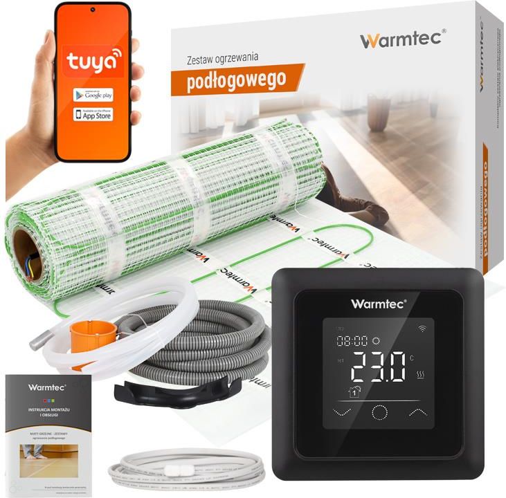 Zestaw elektrycznego ogrzewania podłogowego Warmtec DSE-20/ZTS czarny 2m² (100W/m²) Zapewnij komfort cieplny sobie oraz Twoim bliskim Zestaw ogrzewania podłogowego Warmtec DSE z regulatorem ZTS eliminuje dyskomfort występujący podczas chłodnego poranka, kiedy posadzka w całym mieszkaniu pozostaje zimna. Poruszanie się po ciepłej posadzce jest dużo bardziej korzystne dla zdrowia. Możliwość regulacji temperatury pozwala na jej precyzyjne ustawienie według własnych preferencji. Sterowanie za pomocą Wi-Fi dzięki aplikacji mobilnej Pozwala na pełną kontrolę ustawień dla danych pomieszczeń z poziomu aplikacji przy użyciu smartfona lub tabletu. W celu uzyskania takiej możliwości należy pobrać i zainstalować dedykowaną aplikację, która jest darmowa. Łatwo w ten sposób tuż przed samym wyjściem zaplanować program przy użyciu smartfona, by móc cieszyć się ciepłem od razu po powrocie do domu. Zmiana ustawień może być dokonywana w każdej chwili oraz z dowolnego miejsca - wystarczy dostęp do internetu. Co wyróżnia regulator temperatury Warmtec ZTS? ✔️ sterowanie Wi-Fi - zarządzanie ogrzewaniem z dowolnego miejsca. Wystarczy dostęp do internetu, by móc połączyć się z dedykowaną aplikacją. ✔️ możliwość ustawiania bloków czasowych - pozwala na określenie temperatury dla danych dni tygodnia oraz godzin, ✔️ funkcja tymczasowego nadpisania temperatury w trybie programowalnym, ✔️ funkcja otwartego okna - jeśli czujnik wykryje nagły spadek temperatury, to regulator wstrzyma pracę mając na uwadze ograniczenie zużycia energii, ✔️ funkcja monitorowania zużycia energii w aplikacji mobilnej - większa kontrola nad kosztami ogrzewania, ✔️ dotykowy wyświetlacz z możliwością ustawienia blokady rodzicielskiej, ✔️ tryb antyzamarzaniowy - idealne rozwiązanie, by podczas mrozów nie doprowadzić do nadmiernego wychłodzenia, ✔️ start adaptacyjny - ogrzewanie zostanie uruchomione odpowiednio wcześniej, by w momencie rozpoczęcia danego bloku czasowego panowała już określona temperatura, ✔️ podtrzymanie pamięci w przypadku zaniku zasilania, ✔️ tryb urlopowy - doskonałe rozwiązanie podczas planowanej dłuższej nieobecności, ✔️ tryb czuwania - aktywacja następuje podczas bezczynności urządzenia, ✔️ 2 czujniki: urządzenie posiada jeden czujnik znajdujący się wewnątrz urządzenia. Natomiast drugi czujnik, to czujnik podłogowy na dołączonym przewodzie, ✔️ wybór czujnika odczytu - w ustawieniach istnieje możliwość określenia, z którego czujnika regulator ma dokonywać odczytu temperatury, ✔️ podwyższony stopień ochrony IP21 - możliwość instalacji w miejscach o podwyższonej wilgotności, ✔️ autodiagnostyka awarii - pomoże w przypadku wystąpienia problemów. Możliwości programowania regulatora Warmtec ZTS Tryb programowalny - zaplanowanie pracy urządzenia na poszczególne dni: 5+1+1 - zaprogramowanie jednakowych ustawień w dni robocze (od poniedziałku do piątku) oraz innych dla soboty i niedzieli, 7 - ustawienia na każdy dzień tygodnia są identyczne. Dostępna jest także możliwość ręcznego sterowania, co daje użytkownikowi pełną kontrolę nad temperaturą panującą w pomieszczeniu. Mata grzejna Warmtec DSE Jednostronne zasilanie - pozwala na definitywne wyznaczenie miejsca, w którym będzie znajdowało się podłączenie zasilania. Mata o mocy 100 W/m2 charakteryzuje się wysoką wydajnością, a to pozwala na szybkie osiągnięcie odpowiedniej temperatury powierzchni. Przewód o grubości 3,6mm nie spowoduje zbyt wielkich zmian w kwestii dotychczas przyjętej wysokości podłogi, a zdecydowanie wpłynie na poprawę komfortu cieplnego. Świetnie sprawdzi się w niesymetrycznych pomieszczeniach, ponieważ można jej nadać odpowiedni kształt. Należy pamiętać jednak o utrzymaniu odpowiedniej odległości między przewodami znajdującymi się na macie oraz nie dopuścić do ich uszkodzenia. Powierzchnia przylegająca do podłoża jest samoprzylepna. Ta cecha ułatwi montaż, ponieważ mata nie będzie się przesuwała podczas rozkładania w pomieszczeniu oraz umożliwi to wyliczenie z dużą dokładnością ilości potrzebnego materiału. Niewiarygodnie łatwy montaż dzięki wszystkim niezbędnym akcesoriom Aby całkowicie ułatwić montaż producent do zestawu z matą grzejną oraz regulatorem temperatury dołączył wszystkie niezbędne akcesoria do montażu ogrzewania podłogowego. Zawartość zestawu: regulator temperatury Warmtec ZTS czarny, mata grzejna Warmtec DSE, czujnik temperatury NTC 10 kΩ (dł. 3m), łuk prowadzący do rurki ochronnej czujnika podłogowego, puszka podtynkowa pod regulator, peszel ochronny przewodów zasilających (dł. 3 m), rurka ochronna podłogowego czujnika temperatury (dł. 2,5 m), instrukcja obsługi i montażu maty oraz regulatora. Specyfikacja techniczna regulatora Warmtec ZTS: model: ZTS, kolor: czarny, rodzaj: programowalny, montaż regulatora: podtynkowy (w puszkę), zasilanie regulatora: sieciowe (230 V), typ: pokojowy, wi-fi: tak, stopień ochrony regulatora: IP21, rodzaj czujnika temperatury: powietrzny i podłogowy, regulacja temperatury: elektronicznie, zakres regulacji temp. powietrza: od +5°C do +40°C, histereza: od 0,5°C do 3°C, max. obciążenie regulatora: 16 A, szerokość: 8,6 cm, wysokość: 8,6 cm, głębokość: 4,7 cm. Specyfikacja techniczna maty grzejnej Warmtec DSE-20: zastosowanie: do użytku wewnętrznego, przeznaczenie: pod płytki, moc jednostkowa: 100 W/m2, powierzchnia grzewcza: 2 m2, wymiar grzewczy: 0,5 x 4 m, wymiar fizyczny: 0,48 x 4 m (+/- 2 cm), moc całkowita: 200 W, rezystancja maty: 264,5 (Ω), napięcie zasilania: 230 V, typ zasilania: jednostronne, grubość maty: 3,6 mm, długość przewodu zasilającego: 2,5 m, podkład: siatka z tworzywa sztucznego z klejem, stopień ochrony: II, IPX7, minimalna temperatura instalacji: 5 °C, maksymalna temperatura otoczenia: 30 