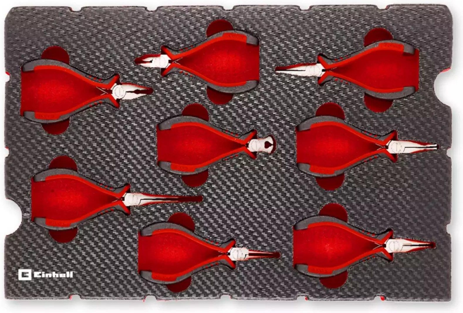Zestaw szczypiec EINHELL E-Case 49370523 (8 szt.) do pracy w wąskich i trudno dostępnych miejscach. Kompatybilny z walizką E-Case S-F – możliwość zastosowania do 2 wkładów. Do delikatnych prac w elektronice, modelarstwie i mechanice precyzyjnej. Precyzyjne chwytanie, cięcie i gięcie wrażliwych elementów. Wykonane ze stali chromowo-wanadowej – wysoka trwałość i odporność na zużycie. Odporność na korozję dzięki niklowanej powierzchni. Dwukomponentowe rękojeści zapewniają pewny chwyt i precyzyjną kontrolę siły. Sprężyny piórowe umożliwiają automatyczne otwieranie i komfortową, mniej męczącą pracę. Ergonomiczna konstrukcja gwarantująca wygodę użytkowania. Część modułowego systemu walizek Einhell E-Case. Boczne wycięcia ułatwiające wyjmowanie i wkładanie wkładu. Wkład z pianki EVA o wykończeniu carbon zapewniający bezpieczne przechowywanie narzędzi. Przejrzysta organizacja – wszystkie narzędzia zawsze pod ręką.