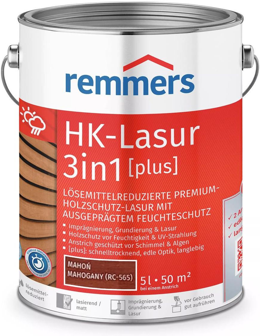 HK-Lazura 3w1 [plus] Impregnat lazurujący Mahoń 5l Szybkoschnąca, niskoprozpuszczalnikowa lazura ochronna premium, silnie chroniąca przed wilgocią, do drewna stosowanego na zewnątrz W skład zestawu wchodzą arkusz (11x28cm) papieru ściernego na płótnie, o gramaturze 120, aby oczyścić powierzchnię …