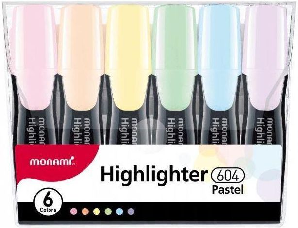 Zakreślacz Monami 604 - komplet 6 sztuk pastel Selgros111 __________________________________________________________________ "• Idealny do dokumentów, żywe, pastelowe kolory • Odporny na blaknięcie • Ergonomiczny kształt, uchwyt wygodny w użyciu" EAN: 8801067259873 Półka: 0 Regał: 0 Parametry …
