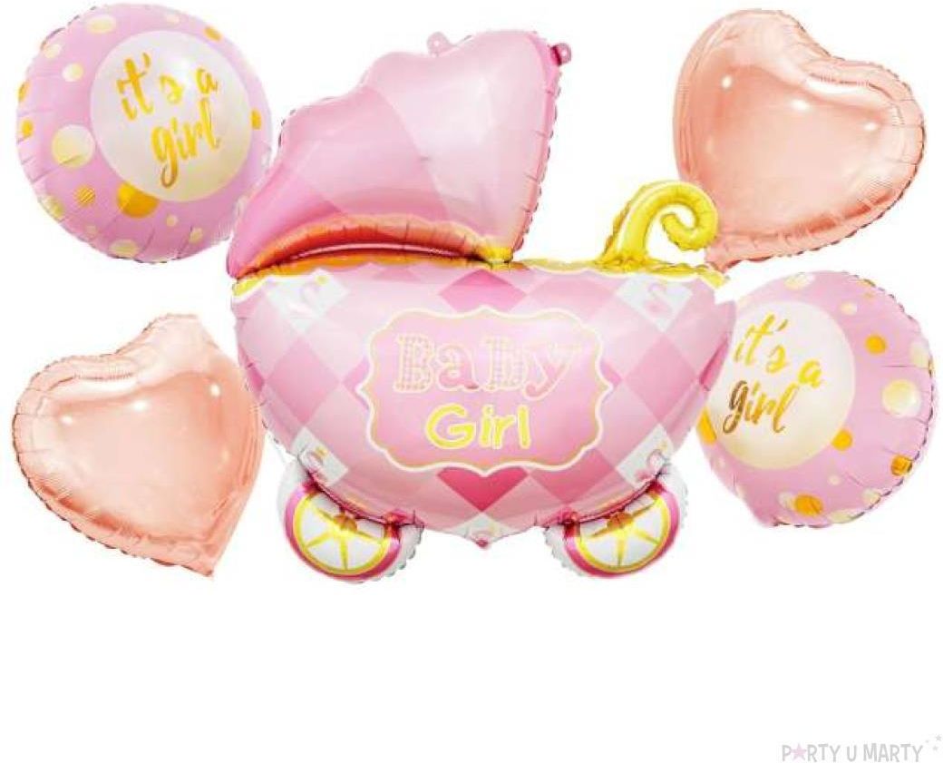Balony foliowe róż - zestaw wózek 5 szt. | BZ-HWZR Balony foliowe róż - zestaw wózek 5 szt. | BZ-HWZR Rozmiar w calach: 24” (wózek), 18” (pozostałe balony) Rozmiar w centymetrach: 60 cm (wózek), 45 cm (pozostałe balony) Kolor: różowy, różowe złoto Nadruk: napisy: „Baby Girl” oraz „It’s a girl” …
