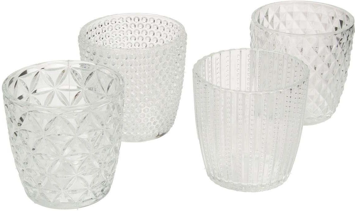 Oryginalny komplet szklanych świeczników we wzory. Zestaw czterech świeczników wykonanych z transparentnego szkła to wspaniała alternatywa dla tradycyjnych lampionów. Każdy świecznik posiada inny, różniący się od pozostałych, wypukły wzór. Świecznik tealight sprawdzi się w salonie i sypialni tworząc nastrojową atmosferę pełną przytulności i ciepła. Wymiary: 1szt.: śr. 9cm, wys. 9cm; waga 0,28kg.