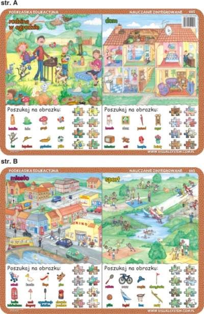 Poszukaj na obrazku: rodzina w ogrodzie, dom, miasto, ogród Zapraszamy do odnajdywania różnorodnych elementów na barwnych obrazkach z zestawu Podkładka edu 005 Visual System. Użytkownik jest zachęcany do poszukiwań na ilustracjach przedstawiających różne sceny: rodzina w ogrodzie, dom, miasto oraz …