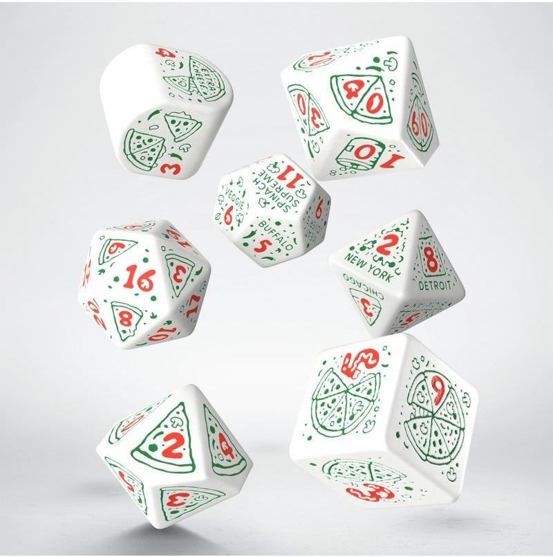 Zestaw Kości Pizza: Pepperoni Oto hołd dla jednego z najpopularniejszych elementów sesji RPG i spotkań towarzyskich – pizzy! Od zawsze epickim przygodom przy stole towarzyszyły przekąski, a wśród nich ta jedyna uwielbiana przez wszystkich. Pizza, ze swoją różnorodnością i uniwersalnością, stała się symbolem tych chwil. Pragnęliśmy oddać hołd tej tradycji, tworząc zestaw kostek, który jeszcze mocniej przeniesie ten smakowity “rekwizyt” do świata gier fabularnych. To właśnie ta miłość do sesji RPG i wspólnych spotkań skłoniła Q-Workshop do stworzenia tego wyjątkowego zestawu. Zestaw Kości Pizza: Pepperoni łączy w sobie pasję do gier oraz kulinarne doznania, oferując kostki, które nie tylko cieszą oko, ale także wprowadzają element zabawy podczas rzutów. Cały zestaw został utrzymany w niebanalnym schemacie kolorów – białym z zielonymi wzorami i czerwonymi cyframi – co dodaje im autentycznego, włoskiego stylu. Zupełnie jak Pepperoni jest pierwszym wyborem dla prawdziwych koneserów pizzy, tak i te kości powinny być na pierwszym miejscu do powiększenia Waszej kolekcji. Design jest inspirowany klasycznym daniem włoskiej kuchni, oferując nie tylko wyjątkowy wygląd, ale także zabawne możliwości. Ścianki kilku kostek przedstawiają różne elementy pizzy, wprowadzając do Twoich sesji smakowity klimat. Dzięki nim możesz wylosować swój styl pizzy, dodatki i extra przysmaki! Dodatkowo, opakowanie przypomina klasyczne pudełko do pizzy w kolorach włoskiej flagi, a jego wytłoczone wnętrze wygląda jak apetyczna pizza! Odrobina pikanterii Sycący Zestaw — Zestaw zawiera 7 elementów: K4, K6, K8, K10, K12, K20 i K100. W tym Modern K4. Pizza Party — Każda kostka ma unikalny design – D8 pozwala wylosować styl pizzy, D12 dodatki, a D4 extra przysmaki. Pieprzna Estetyka — Tło kostek jest białe z zielonymi wzorami i czerwonymi cyframi, co oddaje kolory włoskiej flagi i wzmaga apetyt. Kulinarne dziedzictwo — Zestaw Kości Pizza jest produkowany w Polsce, UE. Producent/osoba odpowiedzialna za bezpieczeństwo produktuQW Sp. z o.o.Trójpole 361-693 Poznanshop@q-workshop.com