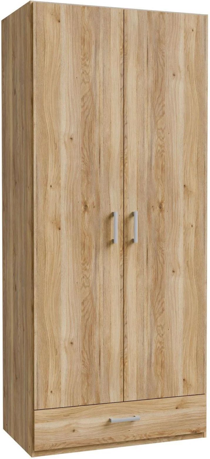 Szafa ubraniowa ECONOBOX 2, producenta Meble Forte, może pełnić funkcję praktycznej garderoby. Mebel oferuje bowiem zarówno miejsce na odzież wiszącą, jak i na ubrania poskładane. Dzięki szufladzie pozwala na wygodne przechowywanie bielizny i akcesoriów. Można również spersonalizować jego wnętrze, dodając do niego kolejne półki, które ułatwiają organizację przestrzeni. Jakie zalety posiada szafa dwudrzwiowa ECONOBOX 2? Szafa dwudrzwiowa z drążkiem i półką z kolekcji ECONOBOX 2 ma prostą budowę, która pozwala jej spełniać podstawowe funkcje mebla do przechowywania. Wykonano ją z wysokiej jakości płyty, odpornej na zarysowania i łatwej do utrzymania w czystości. We wnętrzu mebla użytkownik znajdzie jedną obszerną półkę, jeden drążek odzieżowy i jedną szufladę na prowadnicach kulkowych. Dodatkowo, może również zamontować we wnęce kolejne półki, dzielące dostępną przestrzeń, aby łatwiej utrzymać w niej porządek. Szafa posiada drzwiczki z uchwytem meblowym, który pomaga zachować wygodny dostęp do zawartości mebla bez pozostawiania śladów na jego eleganckim froncie. Jak wygląda szafa w kolorze drewna ECONOBOX 2? Prezentowana szafa dwudrzwiowa z szufladą ECONOBOX 2 ma prostą, minimalistyczną bryłę, która nie przytłacza żadnej aranżacji. Mebel wybarwiono na dekor Dębu Mauvella z wyraźnym rysunkiem słojów, co nadaje mu równocześnie elegancji i ciepły wygląd. Szafa nie zajmuje wiele miejsca, oferując przy tym dużą przestrzeń do przechowywania. Pasuje do różnych stylów aranżacyjnych i nie przytłacza niewielkich pomieszczeń, takich jak sypialnia czy garderoba. Wymiary szafy Szerokość: 88,9 cm Głębokość: 54,2 cm Wysokość: 210,5 cm