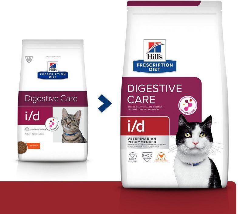Hill's Prescription Diet i/d to wysoce strawna sucha karma dla kotów o składzie specjalnie opracowanym w celu wspomagania ograniczania objawów rozstroju żołądkowego i zapewniania łatwego wchłaniania składników pokarmowych. Jest wzbogacona elektrolitami i witaminami B, aby wspomagać zastępowanie utraconych składników pokarmowych. Wyprodukowana z użyciem firmowej technologii składników ActivBiome+, czyli specjalnej kombinacji prebiotycznych źródeł błonnika o potwierdzonej klinicznie skuteczności szybkiego odżywiania mikrobiomu jelitowego, na rzecz wspierania optymalnej jakości stolca oraz zdrowego stanu układu pokarmowego. Wzmocniona kwasami omega-3 i omega-6 oraz przeciwutleniaczami o klinicznie potwierdzonym działaniu na rzecz wspierania zdrowego stanu układu odpornościowego. Sucha karma dla kotów Hill's Prescription Diet i/d zaspokaja szczególne potrzeby żywieniowe kociąt i kotów dorosłych i zawiera kurczaka w celu zapewnienia doskonałego smaku, który Twój kot pokocha. Jak to działa? Wysoce strawny skład wspierający łatwe wchłanianie składników pokarmowych Unikalna kombinacja prebiotyków na rzecz wspomagania aktywności korzystnych bakterii jelitowych Wyprodukowana z użyciem firmowej technologii składników ActivBiome+, czyli specjalnej kombinacji prebiotycznych źródeł błonnika, w celu szybkiego odżywiania mikrobiomu jelitowego Wysoka zawartość elektrolitów i witamin B Przeciwutleniacze o klinicznie potwierdzonym działaniu Wzbogacona kwasami omega-3 i omega-6 W jaki sposób pomaga? Hill's Prescription Diet i/d to pyszna karma dla kotów o klinicznie potwierdzonej skuteczności odżywania mikrobiomu jelitowego i wspomagania ograniczania objawów rozstroju żołądkowo-jelitowego. Wysoce strawne pożywienie uzupełniające utracone składniki pokarmowe Działa szybko w celu wspomagania zdrowego stanu stolca i poprawy trawienia Pomaga odzyskać energię i wspiera zdrowy stan układu odpornościowego Zaspokaja szczególne potrzeby żywieniowe kociąt i dorosłych kotów S+OXSHIELD: Skład opracowany w celu wspomagania uzyskiwania składu moczu ograniczającego ryzyko powstawania kryształów ze struwitu i szczawianu wapnia Dodatkowe informacje Sucha karma dla kotów Hill's Prescription Diet i/d całkowicie zaspokaja potrzeby żywieniowego Twojego kota. Skonsultuj się z lekarzem weterynarii, aby uzyskać więcej informacji na temat tego, jak karmy Prescription Diet mogą pomagać Twojemu kotu cieszyć się aktywnym życiem w zdrowiu. SKŁADNIKI: SKŁAD: mięso i składniki pochodzenia zwierzęcego (kurczak 19%), zboża, oleje i tłuszcze, białkowe ekstrakty warzywne, jaja i produkty pochodne jaj, składniki pochodzenia roślinnego, minerały, owoce, nasiona. SKŁADNIKI ANALITYCZNE: białko 36,8%, tłuszcz 19,9%, surowy błonnik 2,2%, surowy popiół 6,6%, wapń 1,1%, fosfor 0,80%, sód 0,37%, potas 0,87%, magnez 0,08%; na kg: witamina A 10 843 j.m., witamina D3 905 j.m., witamina E 800 mg, witamina C 100 mg, beta-karoten 1,5 mg, witamina B1 28,6 mg, witamina B12 0,20 mg. DODATKI NA KG: Dodatki żywieniowe: 3b103 (żelazo) 95,6 mg, 3b202 (jod) 4,2 mg, 3b405 (miedź) 11,2 mg, 3b502 (mangan) 9,9 mg, 3b603 (cynk) 148 mg; z naturalnym przeciwutleniaczem. Karma bytowe dla dorosły Schemat żywienia mieszanego Waga kota — kg Dzienna porcja - 85 g pouches Dzienna porcja w gramach 2 1 + 15 g 3 1 + 30 g 4 1 + 40 g 5 1 + 50 g 6 1 + 60 g 7+ 1 + 10 g na kg Karma bytowe dla dorosły Schemat żywienia mieszanego Waga kota — kg Dzienna porcja — puszki 82g Dzienna porcja w gramach 2 1 + 15 g 3 1 + 30 g 4 1 + 40 g 5 1 + 50 g 6 1 + 60 g 7+ 1 + 10 g na kg Karma bytowe dla dorosły Waga kota — kg Dzienna porcja w gramach 2 35 3 50 4 60 5 70 6 80 7+ 12 na kg Wzrost 4 do 6 miesięcy Schemat żywienia mieszanego Waga kota — kg Dzienna porcja - 85 g pouches Dzienna porcja w gramach 0,5 1 + 10 g 1 1 + 25 g 1,5 1 + 40 g 2 1 + 55 g 3 1 + 80 g 4 1 + 105 g 7+ 1 + 23 g na kg Wzrost 4 do 6 miesięcy Schemat żywienia mieszanego Waga kota — kg Dzienna porcja — puszki 82g Dzienna porcja w gramach 0,5 1 + 5 g 1 1 + 25 g 1,5 1 + 40 g 2 1 + 55 g 3 1 + 80 g 4 1 + 105 g 7+ 1 + 23 g na kg Wzrost 7 do 12 miesięcy Schemat żywienia mieszanego Waga kota — kg Dzienna porcja - 85 g pouches Dzienna porcja w gramach 0,5 0.5 + 10 g 1 1 + 15 g 1,5 1 + 30 g 2 1 + 40 g 3 1 + 60 g 4 1 + 80 g 5 1 + 100 g 6 1 + 115 g 7+ 1 + 18 g na kg Wzrost 7 do 12 miesięcy Schemat żywienia mieszanego Waga kota — kg Dzienna porcja — puszki 82g Dzienna porcja w gramach 0,5 0.5 + 10 g 1 1 + 15 g 1,5 1 + 30 g 2 1 + 40 g 3 1 + 60 g 4 1 + 80 g 5 1 + 100 g 6 1 + 115 g 7+ 1 + 18 g na kg Wzrost Waga kota — kg Dzienna porcja - (grams) - Wzrost poniżej miesięcy Dzienna porcja - (grams) - Wzrost 4 do 6 miesięcy Dzienna porcja - (grams) - Wzrost 7 do 12 miesięcy 0.5 30 25 20 1 50 45 35 1.5 70 60 45 2 90 75 60 3 120 100 80 4 125 100 5 145 115 6 135 7+ 20 na kg Wzrost poniżej miesięcy Schemat żywienia mieszanego Waga kota — kg Dzienna porcja - 85 g pouches Dzienna porcja w gramach 0,5 1 + 15 g 1 1 + 35 g 1,5 1 + 55 g 2 1 + 70 g 7+ 1 + 28 g na kg Wzrost poniżej miesięcy Schemat żywienia mieszanego Waga kota — kg Dzienna porcja — puszki 82g Dzienna porcja w gramach 0,5 1 + 10 g 1 1 + 35 g 1,5 1 + 50 g 2 1 + 70 g 7+ 1 + 28 g na kg Poproś lekarza weterynarii o podanie szczegółowej instrukcji żywienia swojego pupila. Zalecane dzienne dawki mają charakter poglądowy i mogą stanowić punkt wyjścia. Waga w gramach to najdokładniejszy pomiar, a liczba miarek jest oszacowana w oparciu o wagę w gramach. Aby uzyskać najlepsze rezultaty: Stopniowo wprowadzaj nową karmę przez kolejne 7 dni lub dłużej. Żyw zwierzę wyłącznie zalecanymi suchymi i mokrymi karmami Prescription Diet. Zapewnij stały dostęp do świeżej wody. Zleć weterynarzowi monitorowanie stanu Twojego pupila. Aby zapobiec uduszeniu, przechowuj opakowanie w miejscu niedostępnym dla zwierząt i dzieci. 4031 