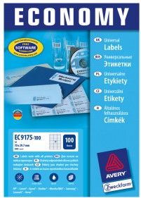 ETYKIETY UNIWERSALNE ECONOMY EUROPE100 BY AVERY ZWECKFORMEtykiety samoprzylepne do wszechstronnych zastosowań. Przeznaczone do wszystkich typoacute;w drukarek atramentowych, laserowych i kserokopiarek. Etykiety posiadają unikalną krawędź QCT, ktoacute;ra zapobiega wydostawaniu się kleju podczas drukowania. Chroni to delikatne elementy drukarki przed uszkodzeniem. Kilkadziesiąt roacute;żnych rozmiaroacute;w etykiet można kupić w opakowaniach zawierających po 100 arkuszy. Etykiety na CD/DVD są pakowane po 25 arkuszy. Na stronie www.europe100.eu można pobrać darmowe oprogramowanie do projektowania i wydruku etykiet. Łatwe w użyciunbsp;i darmowe szablony oraz oprogramowanie dostępne nanbsp;www.avery-zweckform.pl. Rozmiar etykiety 70 x 29,7nbsp;nbsp;mm Ilość etykiet na arkuszu 30 Ilość arkuszy w opakowaniunbsp;100 w formacie A4 Ilość etykiet w opakowaniunbsp;3000 Kolor biały Kod producenta ELA047 "Nr oferty xSale ZW022
