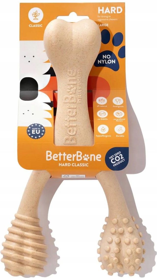 Kości BetterBone - nowy standard wśród zabawek do żucia dla psów! Szukasz zdrowej i trwałej zabawki do gryzienia dla swojego pupila? Poznaj innowacyjne kości do żucia dla psów BetterBone, wykonane z naturalnych, hipoalergicznych składników, takich jak celuloza i olej roślinny o jakości spożywczej! Kości BetterBone Large przeznaczone są dla psów ras dużych od 18 kg, a dzięki twardości HARD będą odpowiednie dla psów, które żują z dużą intensywnością. Powody, dla których Twój Pies pokocha kości do żucia BetterBone: Naturalne składniki - wykonane głównie z celulozy spożywczej - włókna, które można bezpiecznie spożywać w niewielkich ilościach. Bezpieczeństwo - kości są zaprojektowane tak, aby łuszczyły się, a nie odpryskiwały, co minimalizuje ryzyko zadławienia, czy zranienia. Ergonomiczny design - konstrukcja dopasowana do łapy psa ułatwia chwytanie i żucie. Różnorodne tekstury - trzy końcówki o różnych teksturach stymulują zmysły psa i wspomagają czyszczenie zębów. Ekologiczna produkcja – produkowane w Europie, zgodnie z surowymi normami UE, bez użycia szkodliwych chemikaliów - nie zawierają ftalanów, parabenów, BPA, substancji rakotwórczych i mutagenów. Bez GMO, bez nylonu, hipoalergiczne, całkowicie naturalne! Dostępne stopnie twardości kości do żucia BetterBone: Soft – dla ząbkujących szczeniąt, starszych psów i psów z wrażliwymi zębami. Medium – dla psów o średniej intensywności żucia. Hard - super wytrzymałe, dla psów, które żują z dużą intensywnością. Dostępne wielkości kości do żucia BetterBone: Mini – dla psów do 7 kg. Small – dla psów do 18 kg. Large – dla psów powyżej 18 kg. Dostępne smaki kości do żucia BetterBone: Classic – hipoalergiczny, niearomatyzowany. Beef - 100% prawdziwej, odwodnionej wołowiny bez sztucznych aromatów. Kości BetterBone nie są zamiennikiem posiłku ani smakołykiem.