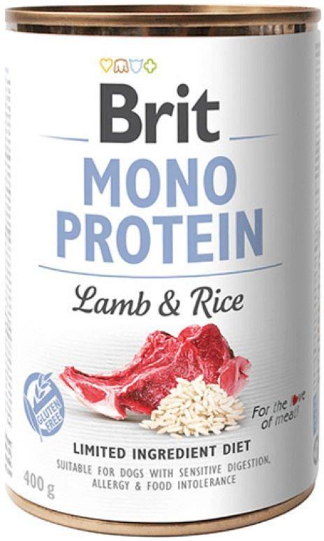 Brit Mono Protein Lamb & Rice 400G BRIT MONO PROTEIN LAMB & RICE PEŁNOPORCJOWA KARMA WILGOTNA Z JAGNIĘCINĄ I RYŻEM DLA PSÓW WSZYSTKICH RAS. ODPOWIEDNIA DLA PSÓW Z WRAŻLIWYM PRZEWODEM POKARMOWYM, ALERGIĄ I NIETOLERANCJĄ POKARMOWĄ Bez soi. Bez glutenu. Bez dodatku konserwantów i barwników. 100% czystego białka jagnięcego. Brit Mono Protein Lamb & Rice zapewnia kompletne i zbilansowane żywienie z ograniczoną liczbą składników. Dzięki zastosowaniu jednego rodzaju białka jest to odpowiednia karma do zmniejszenia ryzyka alergii i nietolerancji pokarmowej. Puszkę należy podawać w temperaturze pokojowej. Dawkowanie karmy może różnić się w zależności od aktywności psa i środowiska, w którym żyje. Podając puszkę celem urozmaicenia i wzbogacenia smaku posiłków, należy odpowiednio pomniejszyć dzienną porcję karmy podstawowej. Należy zapewnić psu stały dostęp do świeżej wody. a Energia Metaboliczna 1 110 kcal/kg SKŁAD 70% jagnięcina (mięso, narządy), 4% ryż, 3% skrobia   grochowa, 1% błonnik grochowy.  SKŁADNIKI ANALITYCZNE białko surowe 9,0%, tłuszcz surowy 7,0%, popiół surowy 2,0%, wilgotność 78,0%,  włókno surowe 0,7%, wapń 0,2%, fosfor 0,3%, sód 0,4% DODATKI DIETETYCZNE NA 1 KG witamina D3 (E671) 250 j.m., witamina E (3a700) 100 mg, cynk (3b606) 15 mg,  żelazo (E1) 10 mg, mangan (E5) 3 mg, jod (3b201) 0,75 mg, miedź (E4) 0,5 mg, biotyna (3a880) 0,2mg DODATKI TECHNOLOGICZNE W 1 KG mączka chleba świętojańskiego (E410) 5 000 mg TABELA DAWKOWANIA SPRAWDŹ CAŁĄ GAMĘ PRODUKTÓW BRIT MONO PROTEIN Profilaktyka przez żywienie - to główna zasada, którą spełniają starannie skomponowane karmy Brit Care. Wiemy, że zwierzęta domowe są w równym stopniu jak my sami narażone na stres i poważne choroby, dlatego z miłości do nich opracowaliśmy unikalną recepturę, opartą na wyselekcjonowanych składnikach. Wierzymy, że odpowiednia dieta ma ogromne znaczenie dla zdrowia i kondycji naszych czworonożnych przyjaciół. Stąd w karmach Brit znajdziecie tylko to, co najlepsze: wysokiej jakości mięso, ryby, warzywa i owoce, zioła oraz składniki funkcjonalne.