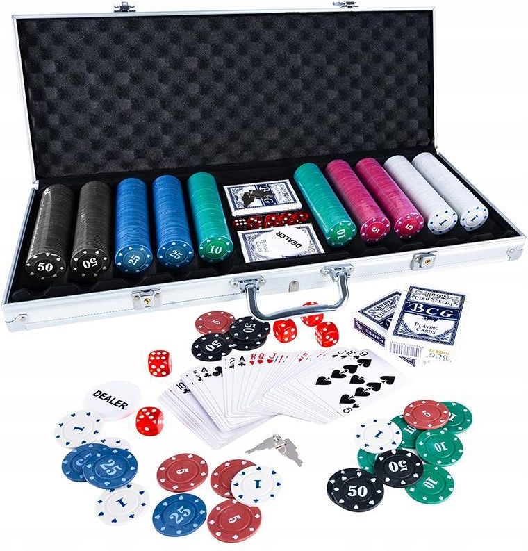 ZESTAW DO POKERA 500 ŻETONÓW WALIZKA KARTY TEXAS KOSTKI ŻETONY POKER DUŻY 500 żetonów z metalowym wkładem ♣️ 5 kostek do gry ♥️ 2 talie kart (po 54 szt.) ♦️ Aluminiowa walizka z zamkiem i kluczykiem ♠️ Mata do gry (zielone sukno) ♣️ Żetony funkcyjne: DEALER, BIG BLIND, LITTLE BLIND ♥️ Transportowy …