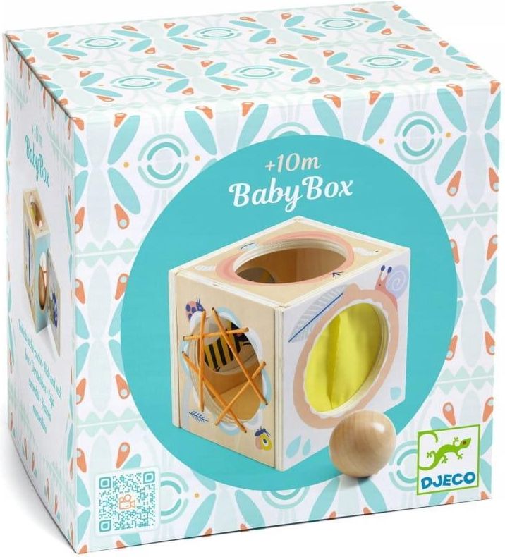 Drewniane pudełko sensoryczne BabyBox marki Djeco. Maluszek wybiera jeden z otworów, w którym schowa piłeczkę. Może włożyć kulkę przez: duży, pusty otwór; otwór częściowo zasłonięty elastycznymi gumkami; otwór zamknięty za małymi drzwiami lub za rozciągliwym materiałem. Niespodzianka: piłka za otworami znika! Następnie należy ją wyjąć i zacząć od nowa. Pudełko sensoryczne to idealna propozycja dla maluszków, zanim spróbują swoich sił z zabawkami typu sorter. W środku pudełka dno wyłożone jest filcem, aby stłumić dźwięk spadającej drewnianej piłeczki. Otwory są na tyle duże, aby małe dziecko nie miało problemu z włożeniem i wyciągnięciem rączki. Zabawka wykonana została z drewna posiadającego certyfikat FSC®. Pudełko wspomaga integrację sensoryczną dziecka. Rozwija jego ciekawość i ćwiczy motorykę małą. Zawartość: 1 drewniane pudełko z otworami, 1 drewniana piłeczka. Wiek: +10 mies. Wymiary produktu: 12,5 x 11,5 x 11 cm