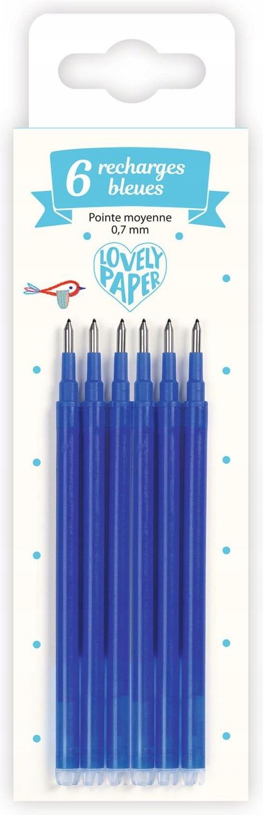 Wkłady do długopisów - 6 sztuk DD03797 Zestaw 6 niebieskich wkładów do długopisów Djeco - średnia końcówka. Wkłady pasują do długopisów DJ03793 oraz DJ03794. Wiek: 6+ Wymiary opakowania: 4,2 x 13,7 x 0,9 cm Opakowanie zbiorcze: 6 szt.