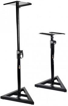STAND4ME MON 1 MKII ZESTAW 2 STATYWY POD GŁOŚNIKI MONITORY STUDYJNE DUŻY UDŹWIG DO 15 KG SZTUKA W ZESTAWIE GUMOWE NÓŻKI I KOLCE NA DYWANY/WYKŁADZINY PŁYNNA REGULACJA WYSOKOŚCI GUMOWE TAŚMY POD GŁOŚNIK ZAPOBIEGAJĄ ZARYSOWANIOM I WIBRACJOM 2 statywy pod monitory dźwięku Stand4Me MON1 MKII to profesjonalne statywy pod monitory studyjne audio, które mogą być również wykorzystane jako stojaki pod niewielkie kolumny głośnikowe lub innego rodzaju sprzęt. Statywy monitorowe MON1 posiadają funkcję płynnej regulacji wysokości w zakresie od 66 cm do 116 cm oraz pinowe zabezpieczenie przed przypadkowym osunięciem sztycy. Umożliwia to bezpieczne i optymalne dostosowanie wysokości stojaków dla uzyskania jak ✅ najlepszego odsłuchu dźwięku. Solidne statywy monitorowe do studia Solidna podstawa MON1 MKII w kształcie trójkąta równobocznego bez problemu utrzyma monitory ważące nawet 15 kg. Górne podstawy statywów są kwadratowe. Posiadają specjalne paski z gumy piankowej pozwalające ✅ uniknąć zarysowań monitorów, tłumiące drgania rezonansowe i zabezpieczające przed przesuwaniem się monitorów w trakcie pracy. Dodatkowo statywy Stand4Me MON1 MKII posiadają gumowe stopki zamienne z metalowymi kolcami przewidzianymi dla dywanów i wykładzin. Dzięki nim można wypoziomować statyw tak, aby całość była stabilna i bezpieczna. Specyfikacja techniczna Materiał: stal Kolor: czarny Powierzchnia: malowana proszkowo Nóżki: gumowe płaskie lub metalowe kolce Wysokość: 66 – 116 cm Rozmiar płyty górnej: 23 x 23 cm Podstawa: 44 x 44 x 44 cm Maks. udźwig: 15 kg