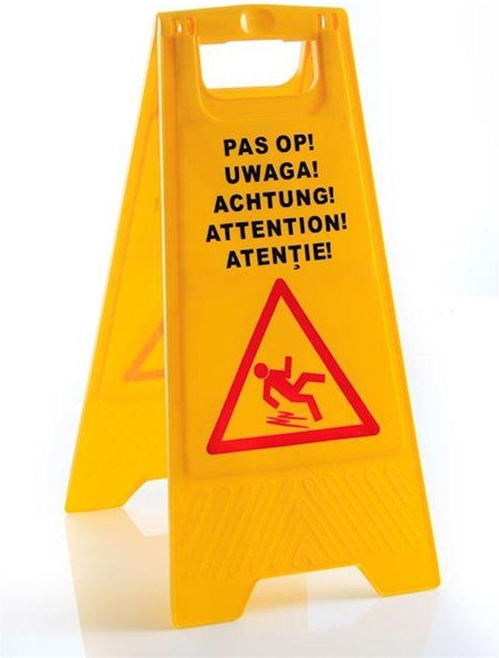Potykacz informacyjny ŚLISKA PODŁOGA. Wykonany z tworzywa w kolorze żółtym. Opisy w 5 językach.