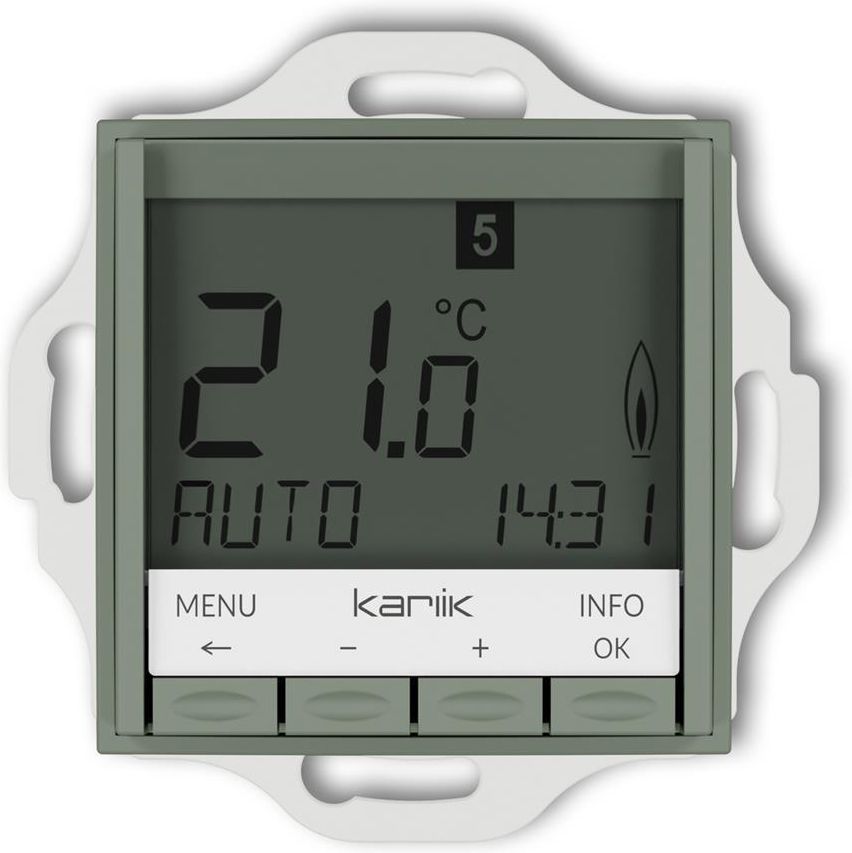 Regulator temperatury elektroniczny (podświetlenie białe) w kolorze szałwiowym z serii MINI, marki Karlik. Regulator temperatury – nowoczesne rozwiązanie do kontroli ogrzewania Regulator temperatury to zaawansowane urządzenie służące do precyzyjnego sterowania temperaturą w pomieszczeniach oraz w systemach ogrzewania podłogowego. Dzięki niemu możliwe jest utrzymanie komfortowej temperatury w domu czy biurze, co przekłada się na wyższy komfort użytkowania oraz oszczędności energetyczne. Tryby pracy regulatora Regulator temperatury oferuje trzy tryby pracy, które umożliwiają dostosowanie jego działania do indywidualnych potrzeb: POMIESZCZENIE – tryb regulacji temperatury powietrza w pomieszczeniu, idealny do utrzymania stałej temperatury. PODŁOGA – tryb regulacji temperatury podłogi, dedykowany systemom ogrzewania podłogowego. OGRANICZNIK – tryb regulacji temperatury powietrza z jednoczesnym ograniczeniem maksymalnej temperatury podłogi, co zapobiega jej przegrzaniu. Jak regulator sprawdza temperaturę? Regulator temperatury posiada wbudowany czujnik temperatury powietrza, aby kontrolować temperaturę podłogi, konieczne jest dokupienie dodatkowej sondy (SO-1), którą można przedłużać kablami do maksymalnie 50 metrów, co zapewnia elastyczność w instalacji. Właściwości regulatora temperatury (zależne od wybranego trybu pracy) Wyświetlanie tekstu w linijkach ułatwiających obsługę Podświetlenie wyświetlacza w kolorze białym Aktualny czas (ustawienie roku, miesiąca, dnia, godziny) Automatyczne przełączenie czasu zimowego i letniego Maks. 9 przedziałów czasowych na dobę (oddzielnych w ciągu doby) Domyślne i dostosowane programy czasowe Start optymalny (temperatura osiągnie wartość ustawioną) Programowalny także po odpięciu jednostki sterującej (wyświetlacza) Funkcja wyłączenia, przycisk MENU należy przytrzymać przez 10 sekund Funkcja wakacje z ustawieniem daty (można ustawić datę od...do) Wyświetlanie zużycia energii (czas włączenia * koszt) za ostatnie 2 dni, tydzień, 30 dni, rok Opcja ustawienia kosztów energii po godzinie Ochrona przed mrozem Temperaturę można nastawić tylko w ograniczonym zakresie Ochrona dostępu (niepożądane przestawienie) Możliwość wyboru języka obsługi Tryb sterowania PWM lub ZAL/WYL Minimalne wartości czasu ZAL/WYL i histerezy ustawione do kontroli ZAL/WYL Możliwość ustawienia wartości min. i max. temperatury podłogi (dotyczy trybu OGRANICZNIK) Ochrona zaworów (dotyczy trybów POMIESZCZENIE I OGRANICZNIK) Możliwość adaptacji do ustawienia zaworów w pozycji otwartej lub zamkniętej (dotyczy trybów POMIESZCZENIE I OGRANICZNIK) Możliwość wyboru funkcji grzania lub chłodzenia (dotyczy trybu POMIESZCZENIE) Pomiar temperatury w pomieszczeniu czujnika wewnętrznego (dotyczy trybu POMIESZCZENIE) lub za pomocą czujnika zdalnego (sondy - do zakupienia osobno) Zegar (Party) określona temperatura w ustawionym przedziale czasu (dotyczy trybów POMIESZCZENIE I PODŁOGA) Temperatura podłogi przedstawiona liczbowo (dotyczy trybu PODŁOGA) Przeciwwskazania użytkowania regulatora temperatury . Regulator temperatury przeznaczony jest do stosowania wyłącznie w pomieszczeniach suchych i w standardowych warunkach otoczenia. Nie należy go instalować w miejscach narażonych na bezpośrednie działanie promieni słonecznych, inne źródła ciepła/zimna oraz na ścianach zewnętrznych. Instalacja powinna być wykonana przez osobę z odpowiednimi kwalifikacjami, a przed przystąpieniem do niej należy wyłączyć napięcie zasilające. Maksymalna długość usuniętej izolacji przewodu nie może przekroczyć 8 mm.
