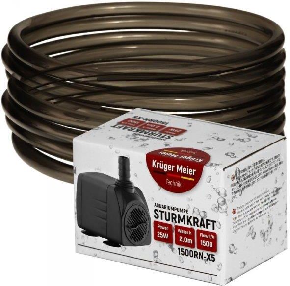 W akwarium:- Szybka i łatwa wymiana wody dla lepszej jakości wody - Nadaje się do zbiorników słodkowodnych i słonowodnych - Niezawodna, wydajna pompa może być używana do usuwania brudnej wody z akwarium i zastąpienia jej świeżą wodą -- Osłona wlotu z regulowanym otworem chroni zwierzęta przed skaleczeniem - Zawiera 3-metrowy wąż i końcówkę do podłączenia węża - Podmiana wody bez konieczności podnoszenia wiadraPozostałe zastosowania:- tworzenie kaskad wodnych, fontann i strumyczków ogrodowych- zasilanie filtracji wody oczka wodnego.- opróżnienie beczek z deszczówka- podlewanie ogródka- osuszanie zalanych terenówInformacje o pompie wody:- może pracować 24/7- całkowicie zanurzeniowa- posiada sitko zabezpieczające przed dostawaniem się większych nieczystości- tolerancja na brudną wodę- regulacja przepływu- posiada oś ceramicznąW zestawie:- pompa wody Kruger Meier Sturmkraft 1500RN-X5- króciec na wąż o średnicy wewnętrznej: 16mm (pasuje wężyk określany jako 16/22 mm)- wąż o średnicy 16/22 o długości 10mDane techniczne:- pobór mocy: 25W - wydajność: 1500l/h - podnoszenie słupa wody: 200 cm - długość przewodu zasilającego: 3m - wymiary 9 x 5.9 x 6.9 cm...
