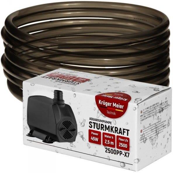 W akwarium:- Szybka i łatwa wymiana wody dla lepszej jakości wody - Nadaje się do zbiorników słodkowodnych i słonowodnych - Niezawodna, wydajna pompa może być używana do usuwania brudnej wody z akwarium i zastąpienia jej świeżą wodą -- Osłona wlotu z regulowanym otworem chroni zwierzęta przed skaleczeniem - Zawiera 3-metrowy wąż i końcówkę do podłączenia węża - Podmiana wody bez konieczności podnoszenia wiadraPozostałe zastosowania:- tworzenie kaskad wodnych, fontann i strumyczków ogrodowych- zasilanie filtracji wody oczka wodnego.- opróżnienie beczek z deszczówka- podlewanie ogródka- osuszanie zalanych terenówInformacje o pompie wody:- może pracować 24/7- całkowicie zanurzeniowa- posiada sitko zabezpieczające przed dostawaniem się większych nieczystości- tolerancja na brudną wodę- regulacja przepływu- posiada oś ceramicznąW zestawie:- pompa wody Kruger Meier Sturmkraft 2500PP-X7- króciec na wąż o średnicy wewnętrznej: 16mm (pasuje wężyk określany jako 16/22 mm)- wąż o średnicy 16/22 o długości 6mDane techniczne:- pobór mocy: 45W - wydajność: 2500l/h - podnoszenie słupa wody: 250 cm - długość przewodu zasilającego: 4m - wymiary 11 x 6.6 x 6.8 cm...