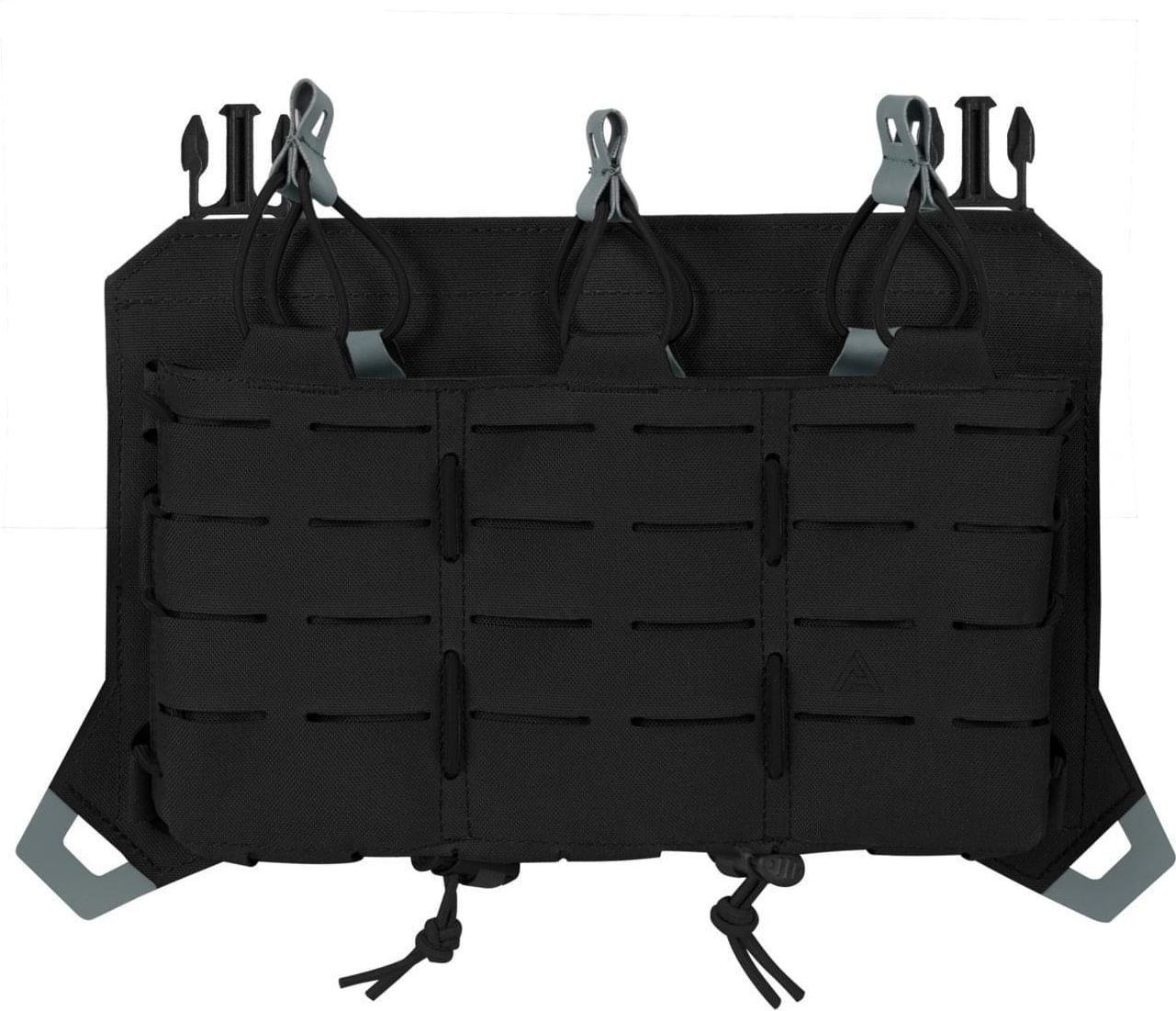 Zrobiona z wytrzymałego materiału Cordura ładownica na trzy magazynki. Dopasowana do mocowania w bocznych otworach przedniego panelu kamizelki Spitfire. Kieszeń wyposażona jest w regulację wysokości oraz boczne ściany z elastycznych ściągaczy, dzięki czemu może pomieścić magazynek o różnej wielkości.Przednia powierzchnia kieszeni pokryta została laserowo ciętym systemem modułowym kompatybilnym z systemem mocowań MOLLE/PALS. Ładownica dedykowana na magazynki do AR, AK lub SR. Kieszeń zamykana jest od góry gumowym oplotem. Rozwiązanie te umożliwia szeroki zakres regulacji i zabezpiecza urządzenia przed przypadkowym wypadnięciem.