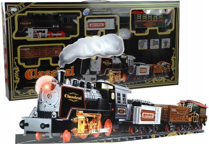 DUŻA Kolejka Elektryczna Wagony Świeci Gra 650 cm 27 elementów 5905214979881 Kolejka elektryczna z wagonami Każdy z nas, nieważne — mały czy duży, uwielbia ekscytującą zabawę z wykorzystaniem kolejki i długich torów. Prezentowany zestaw składający się z 27 elementów jest znakomitą okazją do rozwinięcia wyobraźni i kreatywności dziecka, a także jego zdolności manualnych oraz koordynacji ruchowej. Ponadto jest to świetny sposób umożliwiający aktywne i niebanalne spędzanie wspólnego czasu rodziców z dziećmi. Niepowtarzalne emocje, jakie towarzyszą składaniu poszczególnych elementów torów i pociągu, to tylko wstęp do prawdziwej, rodzinnej rozrywki. Niesamowicie realistyczny wygląd kolejki, a także jej tory o imponującej długości, zachęcą każdego malucha do tej wspaniałej zabawy. Dlaczego warto wybrać właśnie ten zestaw? Ze względu na wzornictwo, jakość, a także rewelacyjne efekty. Zestaw składa się z: lokomotywy, 3 wagonów, stacji kolejowej, 22 różnych torów. Tory odznaczają się swą długością — łącznie osiągają aż 650 cm. Ich połączenie jest bardzo proste i bardzo trwałe. Co ciekawe — można układać je w przeróżnych kombinacjach, urozmaicając tym zabawę. Lokomotywa kolejki jeździ w przód i w tył, wypuszcza dym z komina, czemu towarzyszą realistyczne efekty dźwiękowe i świetlne. Wagony dołączone do zestawu można przyczepiać do kolejki według własnego pomysłu — mechanizm ten jest bardzo intuicyjny. W zestawie znajduje się również stacja kolejowa, która tworzy ten zestaw kompletną, niesamowicie ciekawą zabawką. Komplet elementów zapakowany jest w duże, eleganckie pudełko z witrynkami ukazującymi poszczególne wagony. Opakowanie posiada rączkę umieszczoną w górnej części pudełka, co sprawia, że przenoszenie zabawki jest lekkie — a złożona zajmuje bardzo mało miejsca. Zabawka przeznaczona jest dla dzieci powyżej 3. roku życia. Wykonano ją z trwałego materiału najwyższej jakości, dzięki czemu bawiąc się można mieć pewność, że kolejka posłuży maluchowi przez długi czas. Plastik ten posiada certyfikat bezpieczeństwa CE, gwarantujący spełnienie wymogów Unii Europejskiej. Elektryczna kolejka zasilana jest 6 sztukami baterii AA 1,5 V, które nie są dołączone do zestawu. Należy umieścić je w dolnej części największej kolejki, co dokładnie przedstawione jest w dolnej części kartonu. Wymiaryelementów: lokomotywa: 30 cm x 8,5 cm x 13,5 cm, wagon srebrny: 16 cm x 9 cm x 9,5 cm, wagon zielony: 22 cm x 8,5 cm x 13 cm, wagon brązowy: 22,5 cm x 8 cm x 9 cm, stacja: 16,5 cm x 7 cm x 5 cm. Wymiary opakowania kolejki: - 84,5 cm x 42 cm x 11 cm.