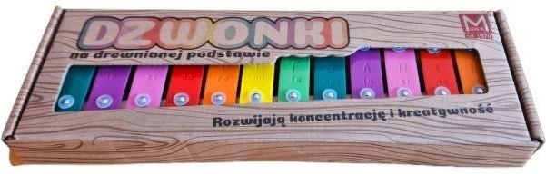 Dzwonki 12-tonowe kolorowe na drewnianej ramie Zabawka - instrument muzyczny perkusyjny, złożony z szeregu metalowych płytek (tonów strojonych elektronicznie). Zabawka, dzięki której dziecko poznaje nuty oraz uczy się grać proste melodie piosenek przy użyciu dwóch pałeczek. Zabawa z dzwonkami diatonicznymi rozwija zdolności muzyczne dziecka i poczucie rytmu. Opakowanie: pudełko