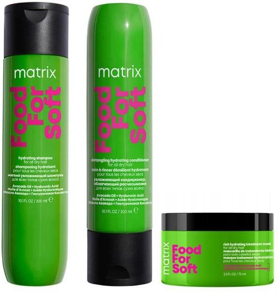 Food For Soft zestaw do suchych włosów Zestaw Food For Soft dedykowany jest suchym włosom, które potrzebują intensywnego nawilżenia oraz miękkości. Świetnie sprawdzi się także do pielęgnacji włosów wysokoporowatych i po zabiegach koloryzacji.Szampon Food For Soft intensywnie nawilża i oczyszcza włosy z zanieczyszczeń oraz sebum, nie pozbawiając ich przy tym potrzebnego im nawilżenia.Odżywka Food For Soft zamyka łuski włosów, pomagając przywrócić odpowiedni poziom nawilżenia włosom przesuszonym i łamliwym. Dzięki niej włosy łatwiej się rozczesują i układają.Maska Food For Soft o bogatej, odżywczej konsystencji pozwala na intensywne nawilżenie nawet bardzo suchych i wysokoporowatych włosów. Po jej użyciu włosy utrzymują odpowiedni poziom nawilżenia, są miękkie, gładkie i łatwe w rozczesywaniu. W zestawie:Szampon Matrix Food For Soft 300 mlOdżywka Matrix Food For Soft 300 mlMaska Matrix Food For Soft 75 ml Matrix Food For Soft To profesjonalna, intensywnie nawilżająca gama od Matrix do pielęgnacji wszystkich rodzajów suchych włosów. Świetnie sprawdzi się także do pielęgnacji włosów wysokoporowatych i po zabiegach koloryzacji. Zawiera olej z awokado i kwas hialuronowy. Przy zastosowaniu systemu składającego się z szamponu, odżywki i olejku włosy zyskują intensywne nawilżenie oraz stają się odczuwalnie miękkie w dotyku. Receptury kosmetyków wzbogacone są olejem z awokado, który pomaga zamknąć łuskę włosa przeciwdziałając utracie wilgoci. Dodatkowo szampon i odżywka Food For Soft wzbogacone są kwasem hialuronowym, który wspiera odpowiednie nawilżenie wszystkich rodzajów włosów. Sposób użycia Produkt odpowiedni do codziennego użytku. Nałóż pożądaną ilość produktu na skórę głowy, a następnie rozprowadź na długości i końce włosów. Spień. Spłucz. Kolejno zastosuj odżywkę - nałóż ją na mokre włosy zaczynając od połowy ich długości, aż po końce. Pozostaw na minutę. Spłucz. Nałóż olejek. W przypadku dostania się preparatu do oczu, natychmiast przepłucz je wodą. Nałóż maskę na umyte i wilgotne włosy od połowy ich długości aż po same końce. Pozostaw na 3-5 minut. Dokładnie spłucz.