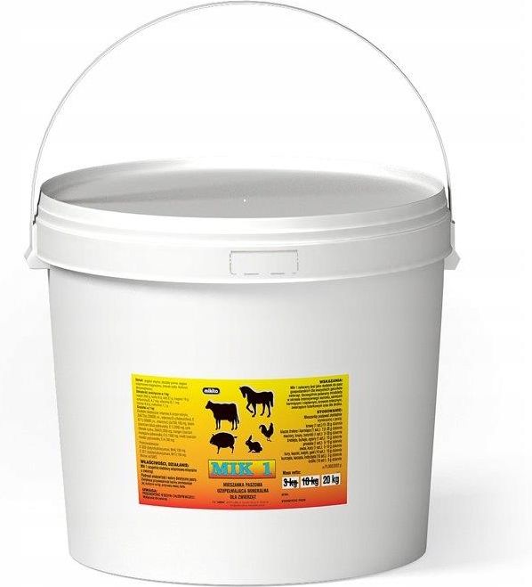 MIKITA MIK-1 20kg - Opis Produktu Mieszanka paszowa uzupełniająca mineralna dla zwierząt. Mik 1 zalecany jest jako dodatek do pasz gospodarskich dla wszystkich gatunków zwierząt. Skład Węglan wapnia Drożdże piwne Węglan wapniowo-magnezowy Chlorek sodu Fosforan dwuwapniowy Analiza Składu Wapń – 200 g Fosfor – 6 g Sód – 27 g Magnez – 18 g Witamina B1 – 4,7 mg Witamina B2 – 1 mg Lizyna – 4,9 g Metionina – 1,1 g Dodatki Na 1 kg Witamina A (octan retinylu, 3a672a) – 200000 j.m Witamina D3 (cholecalciferol, 3a671) – 50000 j.m Witamina E (3a700) – 100 mg Żelazo (siarczan żelaza jednowodny, 3b103) – 2000 mg Cynk (tlenek cynku, 3b603) – 2000 mg Mangan (siarczan manganu jednowodny, 3b503) – 1500 mg Miedź (siarczan miedzi pięciowodny, 3b405) – 240 mg E 320 (butylohydroksyanizol, BHA) – 100 mg E 321 (butylohydroksytoluen, BHT) 100 mg Dawkowanie Mieszankę podawać dokładnie wymieszaną z paszą: krowy (1 szt.) : 15-30 g, klacze źrebne i karmiące (1 szt.) : 7,5-20 g dziennie, maciory, knury, tuczniki (1 szt.) : 5-20 g dziennie, źrebięta, buhaje, ogiery (1 szt.) : 15 g dziennie, prosięta (1 szt.) : 5-10 g dziennie, owce, kozy (1 szt.) : 5-10 g dziennie, kury, kaczki, indyki, gęsi (10 szt.) : 15 g dziennie, kurczęta, kaczęta, indyczęta (10 szt.): 5 g dziennie, króliki (10 szt.) : 5 g dziennie, Dodatkowe Informacje Szczególnie polecany młodzieży w okresie intensywnego wzrostu, samicom karmiącym i ciężarnym, krowom mlecznym, zwierzętom futerkowym oraz dla drobiu. Mik 1 uzupełnia niedobory witaminowo-mineralne u zwierząt. Podnosi smakowitość i walory dietetyczne paszy. Zwiększa przyswajalność karmy zmieniając jej zużycie na kg przyrostu masy ciała.