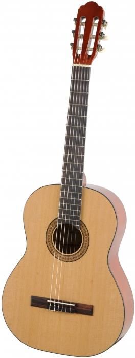 Miguel Esteva Camila 4/4 Są instrumenty, które mimo niewygórowanej ceny prezentują wyjątkowo dobrą jakość wykonania i brzmienia. Gitary marki Esteva Camila są doskonałym tego przykładem. Precyzja wykonania w oczywisty sposób przekłada się na funkcjonalność i niezawodność. Model Camila to najlepszy wybór dla początkujących, uczących się gitarzystów. Istotną zaletą tej gitary jest również wygodny gryf, który zachęca do wielogodzinnych ćwiczeń. Warto zauważyć, że producent bardzo dużą wagę przywiązuje do jakości i gatunków użytego drewna. Połączenie świerku i mahoniu zaowocowało zrównoważonym brzmieniem z ciepłymi basami i dobrze słyszalną górą pasma. Instrumenty Miguel Esteva są co raz częściej polecane przez profesjonalnych nauczycieli gry. Uwagę przyciąga także elegancki, klasyczny wygląd i lakierowane na wysoki połysk pudło rezonansowe. Dzięki bardzo dobrej relacji jakości do ceny i wyróżnianiu się na tle konkurencji, gitary te mają szansę stać się jednymi z najpopularniejszych instrumentów do nauki w naszym kraju. Model 4/4 przeznaczony jest dla osób dorosłych i dzieci w wieku powyżej 10 lat.