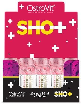 OstroVit Kolagen Morski Shot 24 x 80 ml OstroVit Kolagen Morski Shot 80 ml to zestaw trzech składników aktywnych w postaci shota o smaku kokosowo-brzoskwiniowym. Nasz kolejny innowacyjny z serii shotów OstroVit preparat zawiera między innymi peptydy kolagenu rybiego typu I, kwas hialuronowy oraz witaminę C. Nasz produkt stworzony został z myślą o wszystkich osobach dbających o piękny i zdrowy wygląd skóry, a także dla osób uprawiających sport, po kontuzjach sportowych lub intensywnym wysiłku fizycznym, w czasie rekonwalescencji po złamaniach oraz w celu regeneracji uszkodzonych stawów. 1 butelka 80 ml to dzienna porcja suplementu 5000 mg peptydów kolagenu rybiego z kwasem hialuronowym i witaminą C w jednej porcji! Pyszna wersja smakowa Właściwości składników zawartych w OstroVit Kolagen Morski Shot 80 ml: KOMPLEKSOWY PREPARAT NA STAWY, ŚCIĘGNA I CHRZĄSTKI – Składniki takie jak kolagen morski typu I, kwas hialuronowy i witamina C stosowane wspólnie przyczyniają się do lepszego funkcjonowania stawów, kości i tkanki łącznej. POPRAWA WYGLĄDU SKÓRY – Kompleks substancji aktywnych naszego suplementu diety wpływa korzystnie na jędrność, elastyczność i napięcie skóry. ŁATWE STOSOWANIE – Idealny dla osób, które unikają suplementacji w postaci tabletek. Wystarczy jedną buteleczkę preparatu o pojemności 80 ml wypić raz dziennie. OWOCOWY SMAK – Owocowy smak brzoskwini z dodatkiem kokosa sprawia, że regularna suplementacja to przyjemność. Sprawdź, jakie działanie wykazują poszczególne składniki aktywne zawarte w suplemencie: Kolagen. To jedno z najważniejszych białek występujących w ludzkim organizmie. Jest obecny prawie we wszystkich ludzkich tkankach. Stanowi podstawowy element budujący m.in. skórę, ścięgna, kości, stawy, rogówkę oka. Wpływa na spoistość, wytrzymałość oraz elastyczność tkanki łącznej. Wzmożona aktywność fizyczna nasila proces niszczenia kolagenu, dlatego bardzo istotna jest jego suplementacja w trakcie intensywnych ćwiczeń i treningów. Niedobór kolagenu ze skór ryb morskich może być przyczyną zaburzeń ruchu, zesztywnienia stawów oraz bólów kręgosłupa, pojawiają się zmarszczki, cellulit, zmniejsza się nawilżenie i jędrność skóry. Najkorzystniejszą formą suplementacji są peptydy kolagenu rybiego typu I z dodatkiem witaminy C. Kwas hialuronowy. Jedną z najbardziej pożądanych zalet kwasu hialuronowego podczas jego suplementacji jest pozytywny wpływ na funkcjonowanie kości, stawów oraz tkanki łącznej. Dzięki swoim właściwościom może też zwiększyć elastyczność skóry, przyśpieszyć powrót do zdrowia po urazach, skaleczeniach, otarciach czy uszkodzeniach tkanek miękkich. Witamina C. Witamina znana z wielu cennych i niezbędnych właściwości. Odpowiada głównie za prawidłowe funkcjonowanie tkanki łącznej oraz kości. W naszym preparacie jako dodatek do kolagenu, dzięki czemu wspomaga jego prawidłową syntezę, co z kolei ma ogromny wpływ na funkcjonowanie chrząstek, dziąseł, skóry oraz zębów.