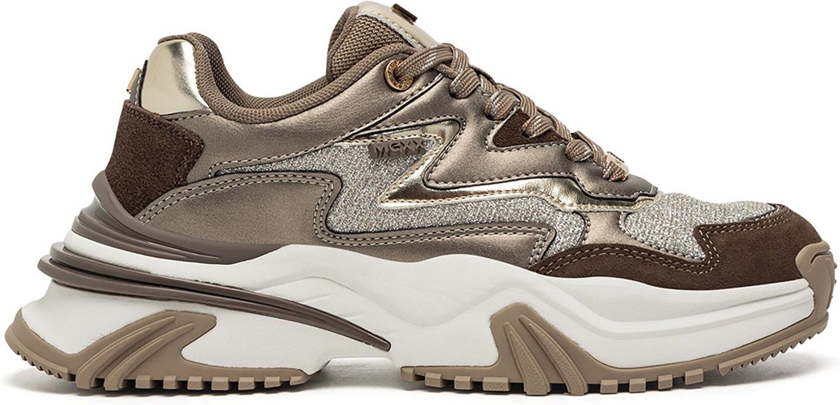 Złote sneakersy Mexx to idealny wybór dla kobiet, które cenią sobie styl i wygodę. Wykonane z wysokogatunkowego tworzywa syntetycznego, gwarantują trwałość i komfort użytkowania. Elegancki, złoty kolor nadaje butom luksusowego wyglądu, który doskonale sprawdzi się zarówno w codziennych, jak i bardziej wyszukanych stylizacjach. Te sneakersy to połączenie modnego designu z praktycznymi rozwiązaniami, które z pewnością spełnią oczekiwania każdej miłośniczki mody. Postaw na jakość i styl z butami Mexx! Mexx to znana na całym świecie marka, która powstała na przełomie lat 70. i 80. XX wieku z połączenia dwóch holenderskich firm - Moustache i Emanuelle. Początkowo tworzyła modne i nowoczesne kolekcje odzieży dla mężczyzn i kobiet, charakteryzujące się swobodnym stylem i niebanalnym wzornictwem. Ubrania Mexx szybko zyskały popularność, przez co poszerzono ofertę o obuwie, akcesoria i perfumy. Dziś to jedna z topowych marek modowych, która kieruje swoje produkty do osób stawiających na autentyzm, komfort i styl. Cechami wyróżniającymi są wysoka jakość wykonania oraz kreatywność. Dlatego buty Mexx to przede wszystkim wygoda zamknięta w oryginalnych - ale nie ekstrawaganckich - fasonach utrzymanych w miejskim stylu, idealnych na różne okazje. Sprawdź ofertę i znajdź model dla siebie!