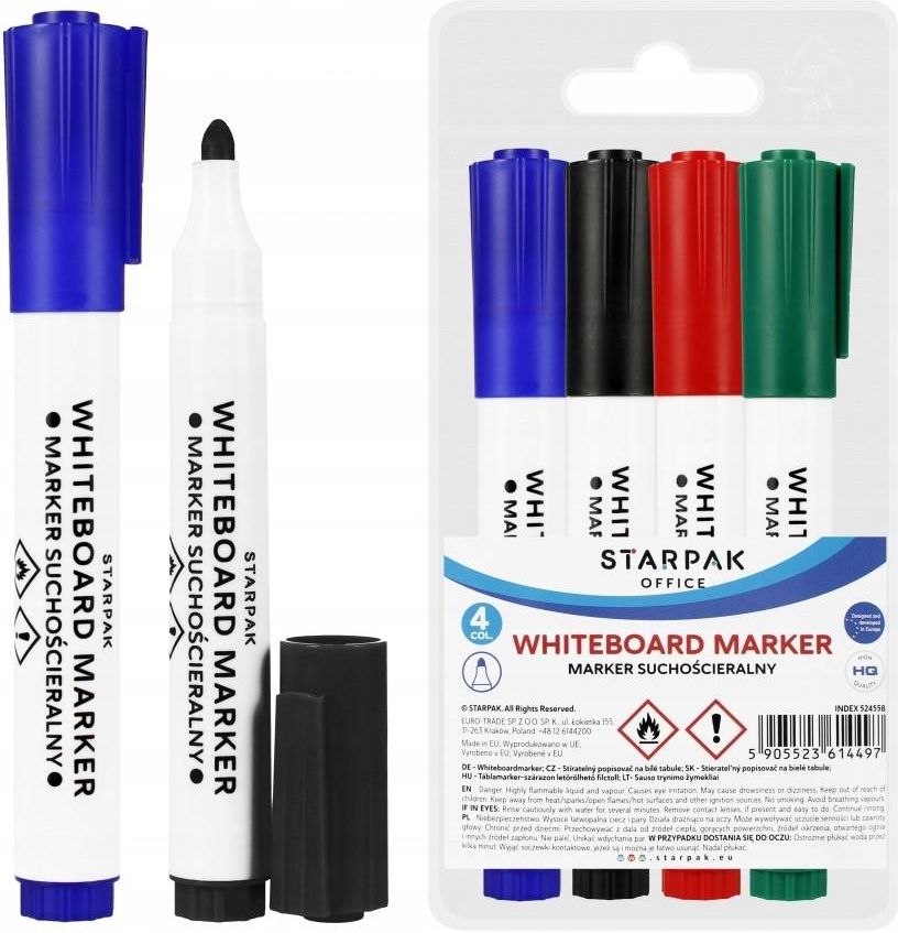 Zalety produktu: marker suchościeralny głównie do pisania po tablicach suchościeralnych, tusz można zmazać za pomocą szmatki lub gąbki bez zostawiania śladów. Markery suchościeralne można też używać do pisania na flipchartach, papierze, kartonie. Są przydatne w szkole, biurze, domu. Marker suchościeralny STARPAK z okrągłą końcówką, pakowany w etui, w czterech kolorach: czarnym, niebieskim, zielonym, czerwonym, szerokość linii pisania ok 2,5mm. Zapoznaj się również z innymi produktami STARPAK dedykowanym dla szkoły i biura Nieodpowiednie dla dzieci poniżej 3 roku życia. Wymiary/waga: wymiary opakowania dł. x wys. x gł. cm 9x18x2, waga opakowania kg. 0,07kg. Karton 30szt.