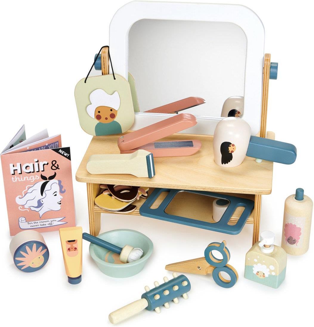 Salon fryzjerski - drewniana toaletka z akcesoriami, Tender Leaf Toys Salon fryzjerski - drewniana toaletka z akcesoriami, Tender Leaf Toys Zapraszamy do salonu fryzjerskiego! Wystylizujemy każdą fryzurę i zadbamy o włosy! W naszym salonie fryzjerskim jest drewniana toaletka z lustrem oraz wszystkie niezbędne akcesoria i kosmetyki fryzjerskie: suszarka, prostownica, maszynka do strzyżenia, lakier do włosów, szampon, miseczka z pędzlem i tubką do mieszania farby, lusterko do ręki, a nawet tablica magnetyczna z 6 wariantami fryzur - do dobrania idealnej fryzury! Zabawa w odgrywanie ról rozwija wyobraźnię i kreatywność dzieci. Rozbuduj salon fryzjerski oraz nasz drewniany zestaw SPA! ~~~ Nasze zabawki produkowane są z drzewa kauczukowego, pochodzącego z kraju położonego na 13 tysiącach rajskich wysp - Indonezji. Do ich pomalowania użyliśmy bezpiecznych i delikatnych farb, dzięki czemu drewno zachowało swój naturalny wygląd i widoczną strukturę. Drewno kauczukowe cechuje się wyjątkową wytrzymałością, co jest niewątpliwym atutem zabawek Tender Leaf Toys. W trosce o naturę, w miejsce każdego drzewa wykorzystanego do produkcji zabawek Tender Leaf Toys, sadzimy nowe drzewo. W Tender Leaf Toys dbamy o zrównoważony rozwój planety i ochronę środowiska naturalnego. ~~~ Zabawki Tender Leaf Toys tworzone są z myślą o najmłodszych przez brytyjską projektantkę Danielle Hanson, która od lat związana jest z branżą dziecięcą. Dzięki jej doświadczeniu, pasji i niezwykłej wyobraźni, zabawki marki Tender Leaf Toys pięknie odwzorowują detale otaczającego nas świata, jak również dbają o rozwój zdolności manualnych i poznawczych dzieci. Wszystkie etapy produkcji zabawek Tender Leaf Toys odbywają się w jednym miejscu, z najwyższą dbałością o środowisko – w egzotycznej Indonezji, kraju słynącym z poszanowania dla własnej kultury i zasobów naturalnych. ~~~ Zestaw zawiera: **Stolik - mała toaletka z lustrem ** Suszarka ** Prostownica ** Nożyczki ** Maszynka do strzyżenia ** Lakier do włosów ** Kosmetyk do włosów ** Szampon ** Miska, pędzel, tubka do farb ** Tabliczka magnetyczna z 6 fryzurami ** Katalog fryzur ** Lusterko Produkt przeznaczony dla dzieci powyżej 3 lat. *************** Wymiary zabawki: 27,5 x 17,5 x 31,5cm Wymiary opakowania: 28,3 x 8,4 x 36,7 cm Salon fryzjerski - drewniana toaletka z akcesoriami, Tender Leaf Toys
