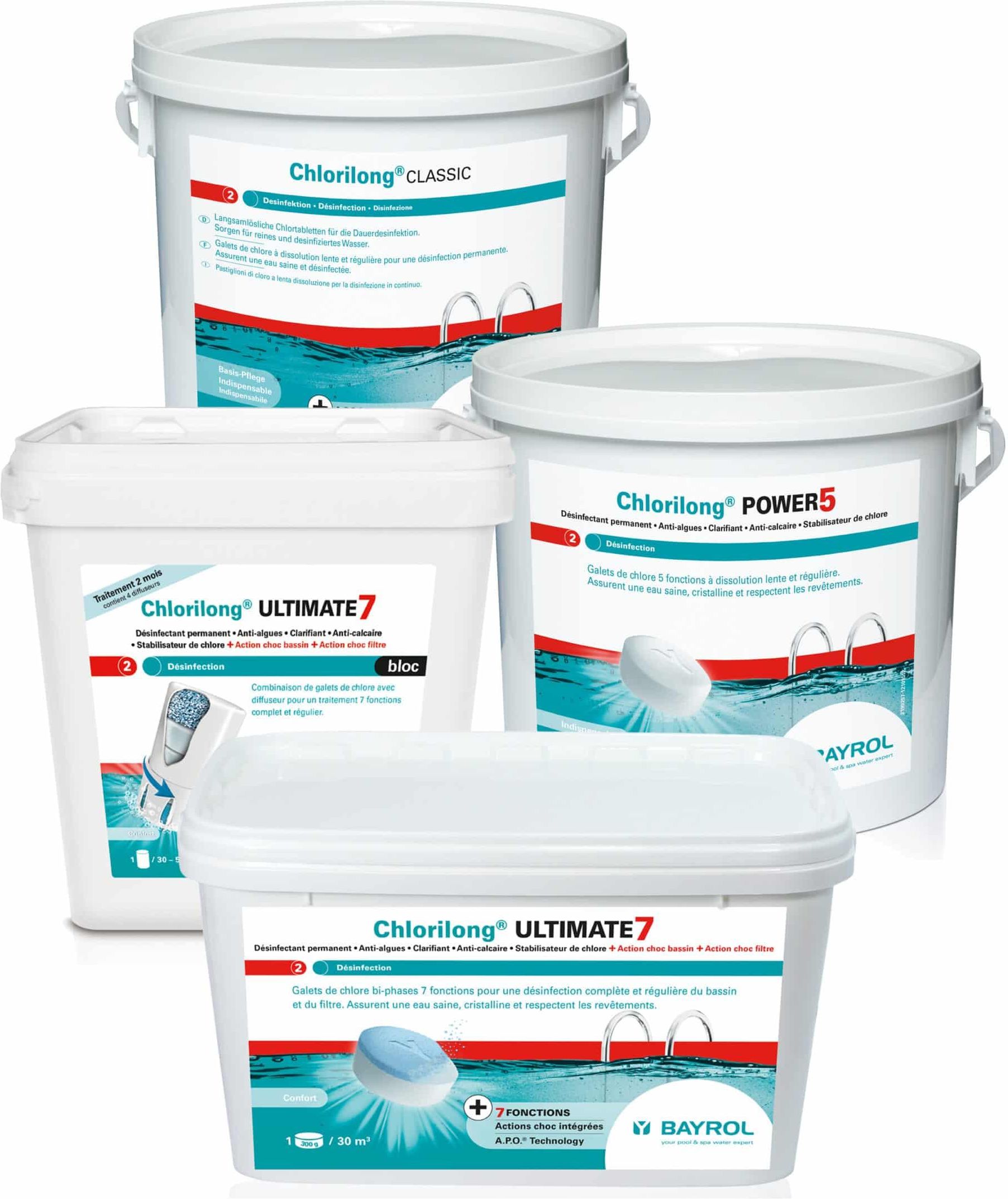 BAYROL Chlorilong Tabletki do BASENU 90% CHLOR 5K BAYROL Chlorilong Tabletki do dezynfekcji wody 90% chloru 5kg 200g Bayrol Chlorilong profesjonalne tabletki z chlorem do basenu w postaci wolno rozpuszczalnych tabletek chlorowych 200g (duże) o bardzo silnym działaniu dezynfekcyjnym. Powoduje szybki rozkład zanieczyszczeń i substancji organicznych powodujących zmętnienie wody w basenach kąpielowych oraz szybko likwiduje glony. Specjalistyczna chemia basenowa na cały sezon basenowy - czysta, bezpieczna i klarowna woda w Twoim basenie. Zalety dużych tabletek chlorowych Chlorilong: jest pozbawiony wapnia i posiada obojętny odczyn pH, szybko usuwa zanieczyszczenia i patogeny obecne w wodzie basenowej, tabletki rozpuszczają się wolno, ale całkowicie w wodzie i nie tworzy osadów, Chlorilong może być stosowany do wody o każdej twardości tabletki, tabletki zawierają aż 90% stabilizowanego wolnego chloru w postaci kwasu trójchloroizocyjanurowego, Bayrol Chlorilong jest odporny na duże nasłonecznienie i wyższą temperaturę wody w basenie. Dozowanie tabletek z chlorem 200g: Aplikacja i dawkowanie - jedna, 200g tabletka Chlorilong jest przeznaczona do uzdatniania wody w basenie o objętości około 30 m3 przez okres do 14 dni. Wskazówki stosowania tabletek CHLORILONG: Przy pierwszym dozowaniu należy zastosować 1 tabletkę na 30 m3 wody w basenie. Przed pierwszym dozowaniem zaleca się przeprowadzenie szybkiego chlorowania za pomocą 2 tabletek Chloriklar lub 50 g Chlorifix na 10 m3 wody w basenie. Dla powstrzymania rozwoju glonów należy regularnie stosować Desalgine lub Desalgine Jet zgodnie ze wskazówkami zawartymi na opakowaniu. W przypadku wody o twardości większej niż 100 dH zaleca się stosowanie stabilizatora twardości wody Calcinex. W celu zapobiegania wytrącaniu się i odkładaniu osadów wapnia przed dozowaniem należy sprawdzić odczyn pH wody i w razie potrzeby skorygować go do optymalnej wartości 7,0 - 7,4. Zawartość wolnego chloru w wodzie mierzona za pomocą testera powinna mieścić się w zakresie 0,5 – 2 mg/l Tabletek nie wolno wrzucać bezpośrednio do wody ze względu na możliwość powstania białych odbarwień na pokryciu basenu, a zwłaszcza folii dozuj środek regularnie i w wymaganej ilości. Przed użyciem należy zapoznać się z etykietą produktu. Opakowanie: 25 tabletek (200g) - 5 kg