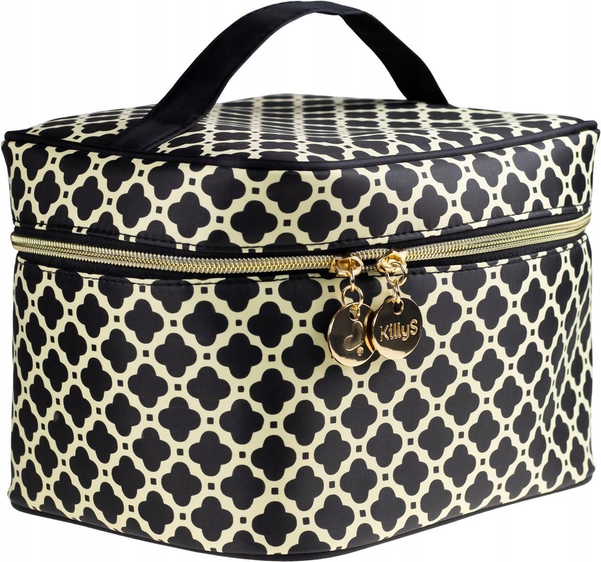 KillyS - Duża kosmetyczka - Kuferek - Marokańska Koniczyna Duża kosmetyczka damska - Kuferek - Marokańska Koniczyna​ marki KillyS. Przeznaczona do przechowywania kosmetyków oraz wszelkich innych akcesoriów do makijażu oraz higieny. Posiada jedną dużą, pojemną komorę, która pomieści wszelkie niezbędne rzeczy podczas podroży, takie jak np. mała suszarka, szczotka, grzebień, kosmetyki kolorowe oraz szampon, żel itp. Dodatkowo kosmetyczka została wyposażona w materiałową rączkę do transportu. Kosmetyczka KillyS wykonana została ze specjalnego materiału, który wykazuje dużą odporność na wilgoć, a także jest bardzo łatwy w utrzymaniu czystości. Posiada kuszący wzór marokańskich koniczyn, który pięknie komponuje się ze złotym zamkiem błyskawicznym. Kosmetyczka. Posiada kształt kuferka. Do przechowywania i organizacji kosmetyków. Została wyposażona w rączkę ułatwiającą transport. Atrybuty Informacje dodatkowe - Wymiary kosmetyczki: 21,5 cm x 16,0 cm x 15,0 cm