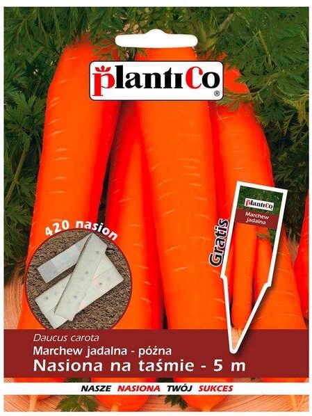 Nasiona Marchwi późnej marki PlantiCo. Nasiona na taśmie długości 5m. Nasiona na taśmie ułatwiają wysiew do gruntu. Równomierne rozmieszczanie nasion eliminuje po wschodach potrzebę przerywki wschodów. Najważniejsze, aby obficie podlać. Dzięki temu taśma celulozowa może się rozpuścić i nasiona zaczynają kiełkować.