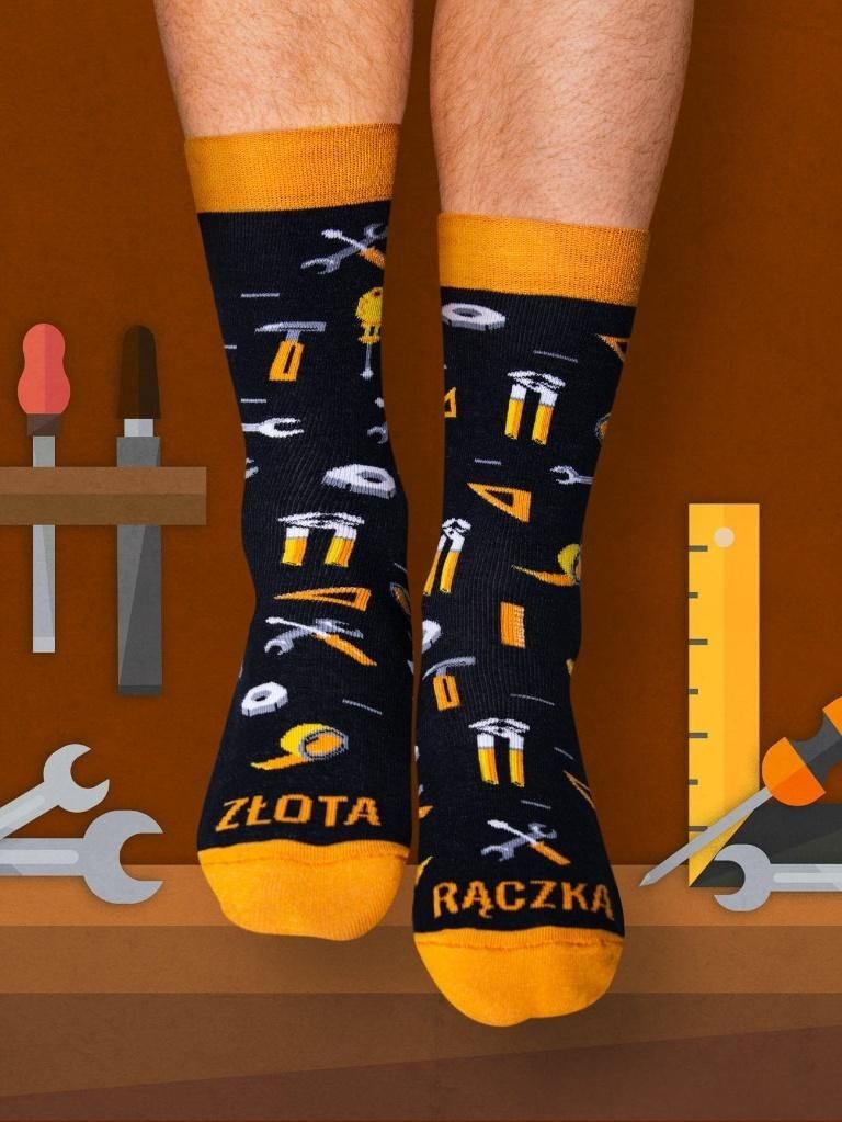 Skarpetki dla Złotych Rąk Czy pragniesz wprowadzać zmiany w otaczającym nas świecie? Rozpocznij od drobnych działań, jak na przykład założenie naszych skarpet ZŁOTA RĄCZKA. Zostały zaprojektowane z myślą o osobach, które z pasją i dokładnością potrafią tchnąć nowe życie w najbardziej kapryśne urządzenia. Te skarpetki oddają hołd mistrzom fachu, którzy niczym artyści z narzędziami w dłoniach, tworzą codzienne dzieła sztuki. Idealny Upominek Nasze skarpetki są doskonałym wyborem na Dzień Chłopaka oraz inne specjalne okazje, by wyrazić wdzięczność i uznanie dla tych, którzy potrafią naprawić rzeczywistość swoimi umiejętnościami. Obdarowanemu przypomną, że jego zdolności są cenniejsze niż złoto. Skarpety ZŁOTA RĄCZKA to świetny prezent dla męża i ojca. Dzięki nim możesz podkreślić wyjątkowość każdej złotej rączki. Cechy Produktu Stworzone z myślą o komforcie, skarpetki zawierają: 80% wysokiej jakości bawełny czesanej. 17% poliamidu, który zwiększa ich wytrzymałość. 3% elastanu, co zapewnia doskonałe dopasowanie do stopy. Mają również nieuciskający ściągacz oraz komfortowy płaski szew na palcach. Skarpetki są wytwarzane w Polsce i zaleca się ich pranie na lewej stronie w temperaturze maksymalnej 40°C, bez prasowania. EAN: 5905159725895