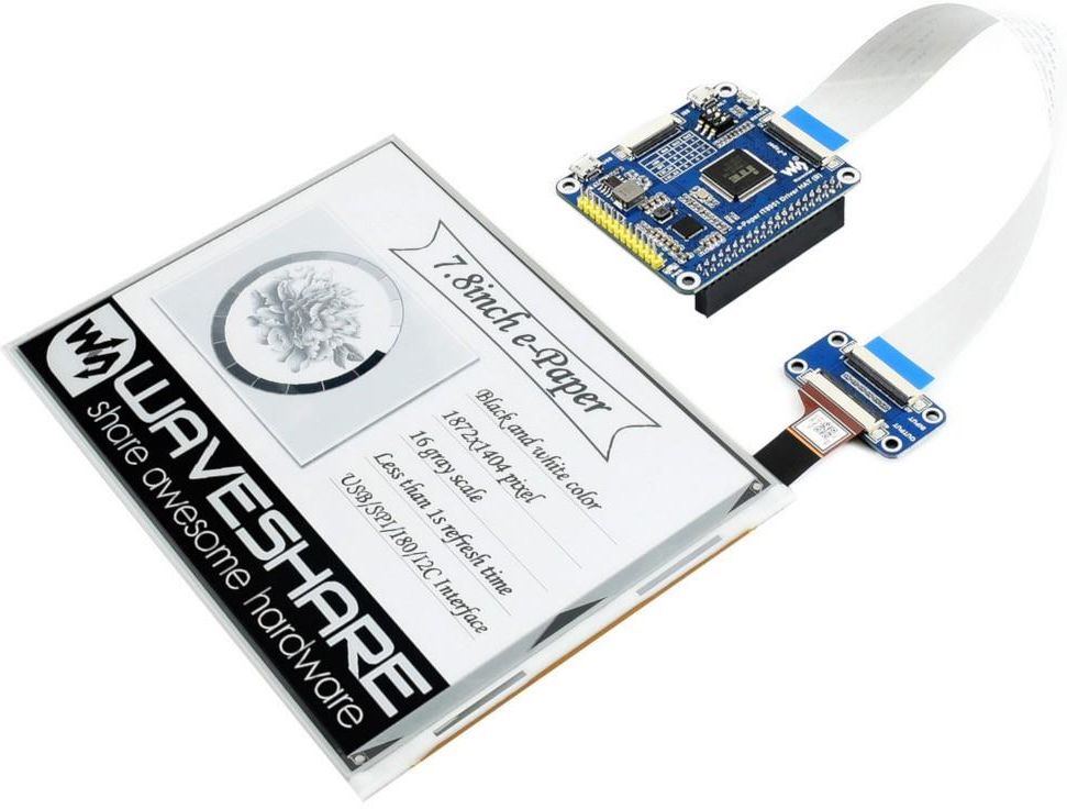 Wyświetlacz Waveshare E-Ink wykonany w technologii e-paper, o przekątnej 7,8" i rozdzielczości 1872 x 1404 px, potrafi wyświetlać dwa kolory: czarny oraz biały. Wspiera odświeżanie częściowe. Ekran współpracuje z Raspberry Pi wraz z nakładką znajdującą się w zestawie. Napięcie zasilania wynosi 5 V.