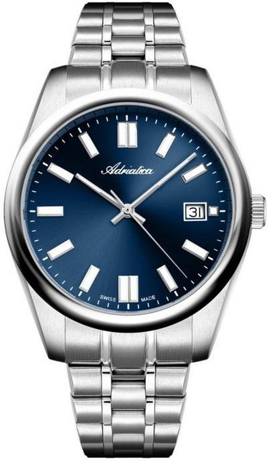 Mechanizm: Typ - KWARCOWY - Mechanizm zasilany baterią srebrową, Koperta: Materiał - STAL NIERDZEWNA, Kształt - OKRĄGŁY, Kolor - SREBRNY Wymiary - SZEROKOŚĆ 40mm / GRUBOŚĆ 9mm, Wodoszczelność - 50M / 5ATM, Szkło - SZAFIROWE - wysoka odporność na zarysowania, Tarcza: Typ - ANALOGOWY - wskazówkowa forma prezentacji czasu, Kolor - NIEBIESKI, Indeksy - w kolorze SREBRNYM, Wskazówki - w kolorze SREBRNYM, Pasek / Bransoleta: Typ - BRANSOLETA, Materiał - STAL NIERDZEWNA, Kolor - SREBRNY, Szerokość przy mocowania - 22mm, Szerokość przy zapięciu - 20mm, Maksymalny obwód - 21cm Funkcje: DATOWNIK - Wskaźnik dni miesiąca. Informacje ogólne: Pochodzenie marki - SZWAJCARIA Przy zakupie otrzymujesz: oryginalny zegarek ADRIATICA, firmowe opakowanie ADRIATICA, instrukcję obsługi, kartę gwarancyjną producenta.