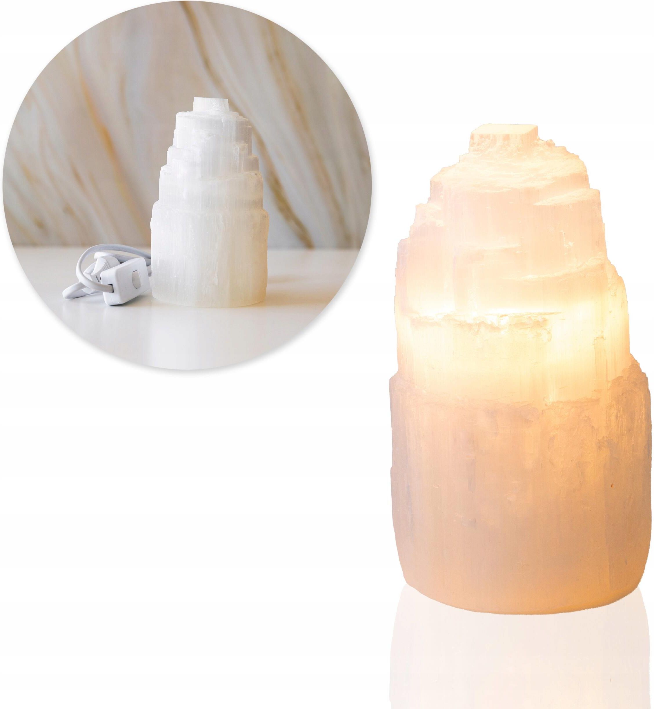 Lampa z Selenitu 15 cm Lampa Stojąca Biurkowa Stołowa Nocna Lampa Selenitowa Specyfikacja Wymiary: ok. 15 cm Waga: ok. 1 kg Materiał: kamień naturalny, selenit Kolor: biały, perłowy, z odcieniami odcieniami żółci lub szarości Zasilanie: sieciowe Długość kabla: 1,4 m Kolor kabla: biały Żarówka: E14, w zestawie Kształt lampy: wieża Przy podstawie jest specjalne wyżłobienie na kabel, dzięki czemu lampa stoi stabilnie. Każda lampa jest inna ze względu na proces rzeźbienia, lampę wysyłamy losowo. Pielęgnacja: selenit jest wrażliwy na wodę - nie należy go moczyć. Lampa z Naturalnego Kamienia Cechy 100% naturalna bryła selenitu: wykonana z prawdziwego kamienia. Subtelny, perłowy połysk: powierzchnia selenitu odbija światło niczym księżycowa poświata - delikatnie, miękko i magicznie. Ręczne wykonanie: każda lampa jest niepowtarzalna, posiada własny układ warstw, włókien i naturalnych rys. Ciepłe, kojące światło: subtelny blask sprzyjający relaksowi i wyciszeniu. Zalety Naturalne piękno i funkcjonalność: może pełnić rolę lampki nocnej, dekoracji lub elementu wspierającego medytację. Tworzy atmosferę spokoju: jej miękkie światło harmonizuje przestrzeń i wprowadza poczucie równowagi. Energetyczne oczyszczenie: według tradycji selenit usuwa negatywne wibracje i przywraca wewnętrzny spokój. Idealna do każdej przestrzeni: w sypialni wprowadzi ukojenie, w salonie doda blasku, a w gabinecie - skupienia i klarowności. Wyjątkowy prezent: dla miłośników natury, duchowego rozwoju i minimalistycznego piękna. Lampa Nocna Dekoracyjna Zastosowanie Lampka nocna: zapewnia ciepłe, relaksujące światło sprzyjające spokojnemu snu. Dekoracja salonu lub gabinetu: podkreśla charakter wnętrza, dodając mu naturalnej elegancji. Lampa medytacyjna: idealna do pracy z energią, oczyszczania i medytacji. Element feng shui: przyciąga jasność, harmonię i równowagę do domowej przestrzeni. Prezent z przesłaniem: symbol czystości, światła i duchowego wzrostu – pełen znaczenia upominek dla bliskiej osoby. Lampa z Selenitu Właściwości kamienia Oczyszczenie i spokój: pomaga usuwać napięcie, stres i negatywne emocje, przywracając wewnętrzną harmonię. Światło umysłu: sprzyja jasności myśli, intuicji i duchowemu przebudzeniu. Ochrona energetyczna: tworzy barierę ochronną przed chaosem i niepożądaną energią z otoczenia. Wsparcie snu: ustawiona przy łóżku wspomaga relaks i pomaga zasnąć w spokojnej atmosferze. Symbol duchowej czystości: uznawany za kamień anielski – otwiera serce i umysł na światło oraz pozytywne wibracje.