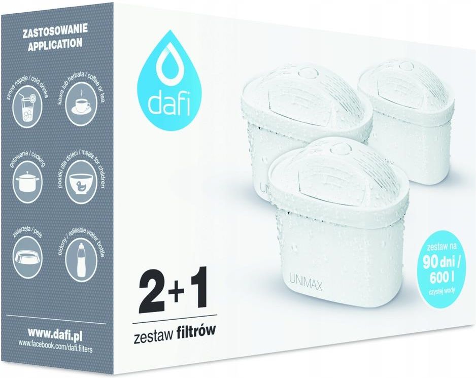 Filtr do dzbanka filtrującego Dafi wkład Unimax 2+1 Filtr Standard Unimax zawiera odpowiednio dobraną i systematycznie kontrolowaną mieszankę filtrującą składającą się z węgla aktywnego i żywicy jonowymiennej. Dzięki temu filtr znacznie redukuje twardość wody , zawartość metali ciężkich, związków chloru oraz innych substancji mogących niekorzystnie wpływać na smak, zapach i barwę wody kranowej. Filtr Standard Unimax przeznaczony jest do polepszania jakości wody kranowej. Dzięki niemu staje się ona idealna do picia, parzenia i gotowania. Woda przefiltrowana Dafi Standard jest alternatywą wody butelkowanej. Dodatkowo zapobiega gromadzeniu się osadu na elementach grzejnych czajnika, żelazka i ekspresu do kawy. Pasujący dzbanek filtrujący: typu Unimax Zoptymalizowaliśmy kształt i działanie filtrów Dafi Unimax. Trwa wymiana opakowań, którą chcemy przeprowadzić w duchu zrównoważonego rozwoju. Dlatego tymczasowo filtr na zdjęciu z opakowania może się różnić od kształtu nowego produktu w środku. Nie wpływa to na jakość przefiltrowanej wody. FILTROWANIE KROK PO KROKU: Krok 1. Górna pokrywa filtra wychwytuje zanieczyszczenia mechaniczne. Odpowiednio zaprojektowana, zapewnia właściwą cyrkulację wody poddawanej filtracji. Krok 2. Siateczka filtrująca zatrzymuje znajdującą się w wodzie zawiesinę lub osad np.: pianę, tłuszcz, rdzę. Krok 3. Żywica jonowymienna usuwa z wody niektóre metale ciężkie, pozwala wychwycić związki odpowiedzialne za kamień kotłowy. Dzięki temu woda jest zmiękczona, a w herbacie nie pojawia się mętny osad. Krok 4. Węgiel aktywny redukuje chlor oraz związki organiczne znajdujące się w wodzie kranowej. Usuwa z niej nieprzyjemny zapach, jak również poprawia smak. Krok 5. Dolna pokrywa o mikroporowatej strukturze przeprowadza powtórną filtrację mechaniczną, zapewniając najwyższą czystość wody. UWAGA! Pierwsza przefiltrowana woda może być mętna. Użyj jej do podlania roślin. Jeśli woda nie przepływa przez filtr - wyjmij go, lekko wstrząśnij i ponownie zainstaluj. Filtr sterylizowany parą, może być mokry - nadaje się użycia ZALECENIA DOTYCZĄCE EKSPLOATACJI Filtrować wyłącznie zimna wodę wodociągową. Wymieniać filtr co 1 miesiąc lub po przefiltrowaniu ok. 200 l wody (w zależności od jej twardości). Chronić wodę filtrowana przed działaniem promieni słonecznych, w przeciwnym razie na filtrze może pojawić się zielony nalot. Filtrować wodę o temperaturze poniżej 30 stopni Celcjusz Zużyć wodę mak. 12 godzin po przefiltrowaniu. Filtr powinien być zanurzony w wodzie przez cały czas użytkowania - jest to gwarancja jego prawidłowego działania.