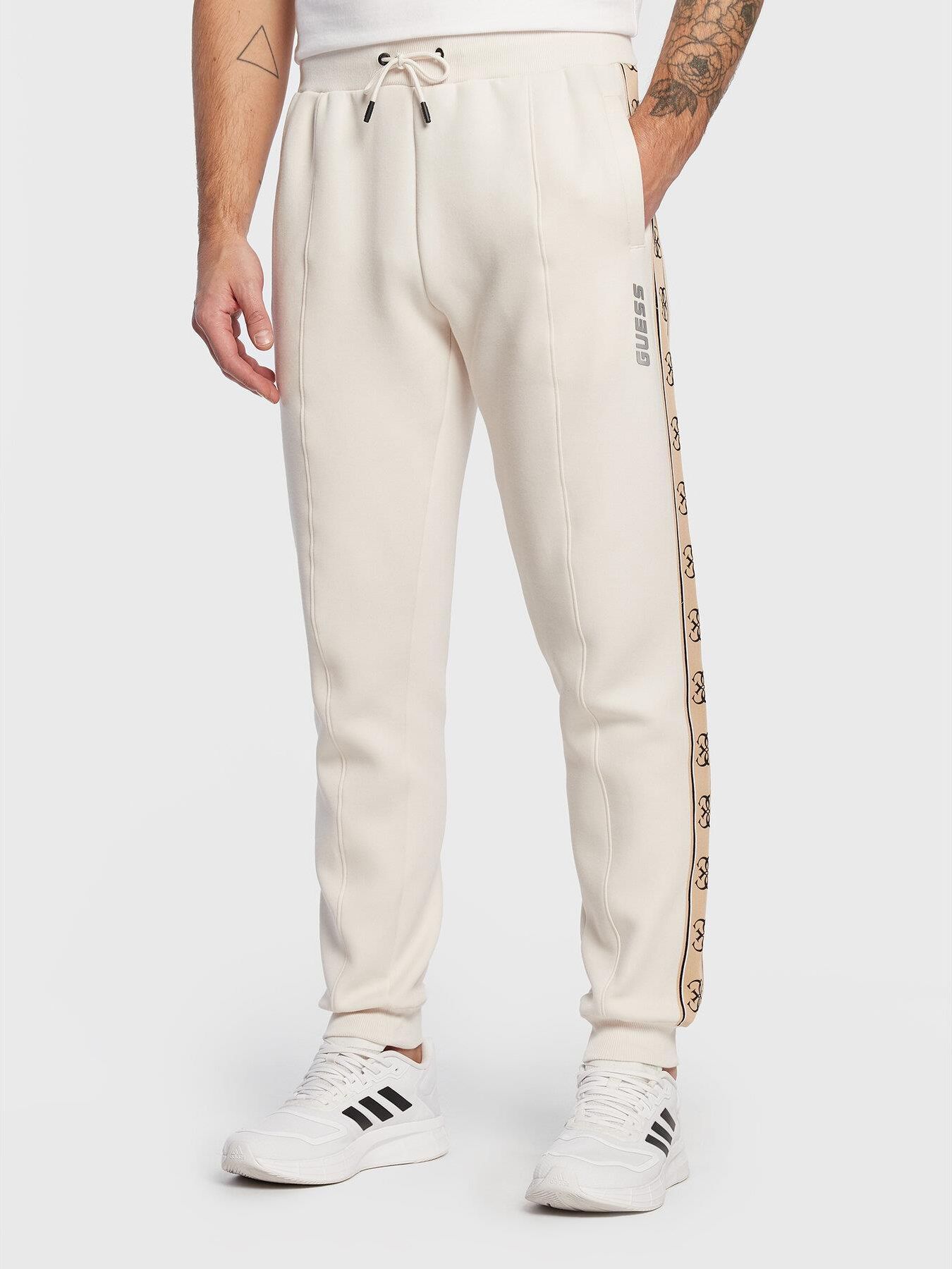 Beżowe spodnie Mickey Cuff Pant, marki Guess.Wymiary modela: wzrost: 190 cm, klatka: 107 cm, pas: 93 cm. Model ma na sobie produkt w rozmiarze L.Wymiary produktu w rozmiarze L: szerokość w pasie: 43 cm, długość nogawki od zewnątrz: 103 cm, długość nogawki od wewnątrz: 76,5 cm.